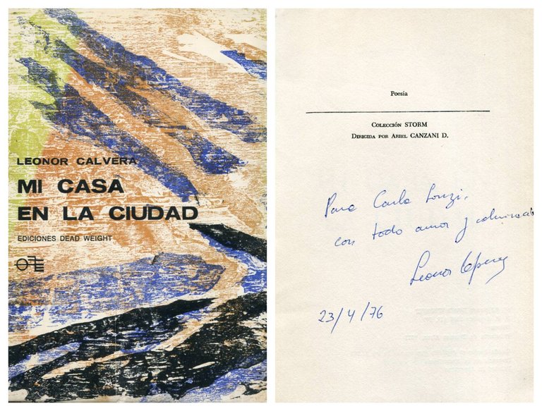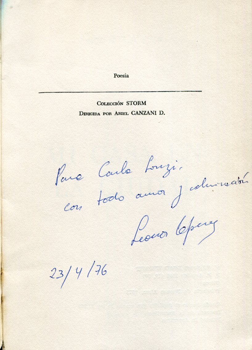 Poesie . 8vo. pp. 84. Dedica autografa dell'Autrice a Carla Lonzi, datata 23/4/1976 (Inscribed and signed by the Author to the Italian feminist, writer, art critic Carla Lonzi). Buono (Good). Sovraccoperta con mancanze (Some lack to dust jacket). Prima edizione (First Edition). . Leonor Calvera (Buenos Aires, 1942 - 2021). Teorica, ricercatrice e scrittrice femminista. Calvera è stata anche uno dei membri dell'Unione femminista argentina (UFA), fondata da María Luisa Bemberg e Gabriela Cristeller nei primi anni 1970. Titoli come El género mujer (pubblicato nel 1982, durante la dittatura militare), Camila O' Gorman (1986) e Women and Feminism in Argentina (1990) sono opere fondamentali per comprendere l'evoluzione del femminismo nel Paese.