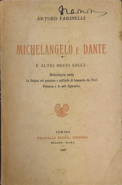 MICHELANGELO E DANTE. E altri brevi saggi: Michelangelo poeta, La Natura nel pensiero e nell'arte di Leonardo da Vinci, Petrarca e le arti figurative. | Libri antichi e moderni | Farinelli Arturo.