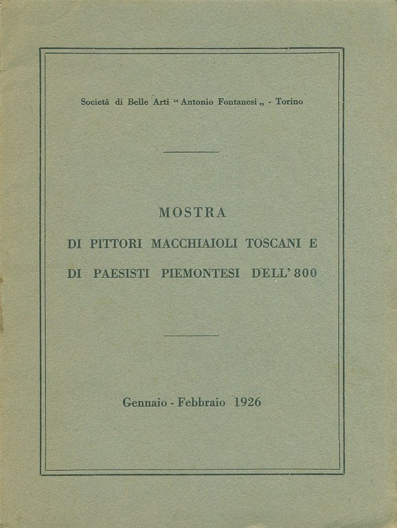 Catalogo di mostra, Società di Belle Arti "Antonio Fontanesi" di Torino, gennaio - febbraio 1926. Con elenco delle 130 opere esposte degli artisti: Antonio Fontanesi, Vittorio Avondo, Lorenzo Delleani, Silvestro Lega, Raffaello Sernesi, Giovanni Fattori, Cristiano Banti, Odoardo Borrani, Giuseppe Abati, Telemaco Signorini, Vito D'Ancona, Adriano Cecioni Stampato dalla Tipografia Celanza di Torino. 16mo (cm 17,5x13). pp. 14. . Ottimo (Fine). . . .