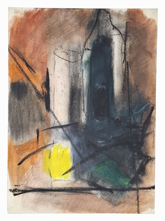 su un foglio da disegno, di dimensioni 24 x 33 cm circa, è stato realizzato, a pastello, un bella opera che rappresenta una bottiglia in vetro e un bicchiere, visti in chiave parzialmente informale. L'opera non è firmata ma è attribuibile con certezza a Miranda Bestazzi (1931 - 1973) in quanto fa parte di un'insieme di opere firmate in originale dall'autrice in nostro possesso. pittrice e smaltatrice italiana, attiva principalmente nel torinese e nel cuneese, nell'ambito della 'Comunità Artistica' fondata da Idro Colombi. La sua produzione comprende dipinti e, in modo significativo, smalti su rame, spesso realizzati in collaborazione proprio con Idro Colombi negli anni '60. L'artista è ricordata come una delle figure femminili che hanno contribuito alla rinascita dell'arte dello smalto a Torino nel secondo dopoguerra. E' ricordata, per altro, la sua presenza in contesti storici artistici legati a Dronero e al Museo Mallè. Stato di conservazione: sui quattro angoli del foglio sono presenti minuscoli forellini creati in passato per fissare, presumibilmente, l'opera a qualche supporto ma, comunque, disegno originale in ottimo stato. Senza cornice. L'opera in vendita fa parte di un'insieme di opere originali di Miranda Bestazzi, in nostro possesso.