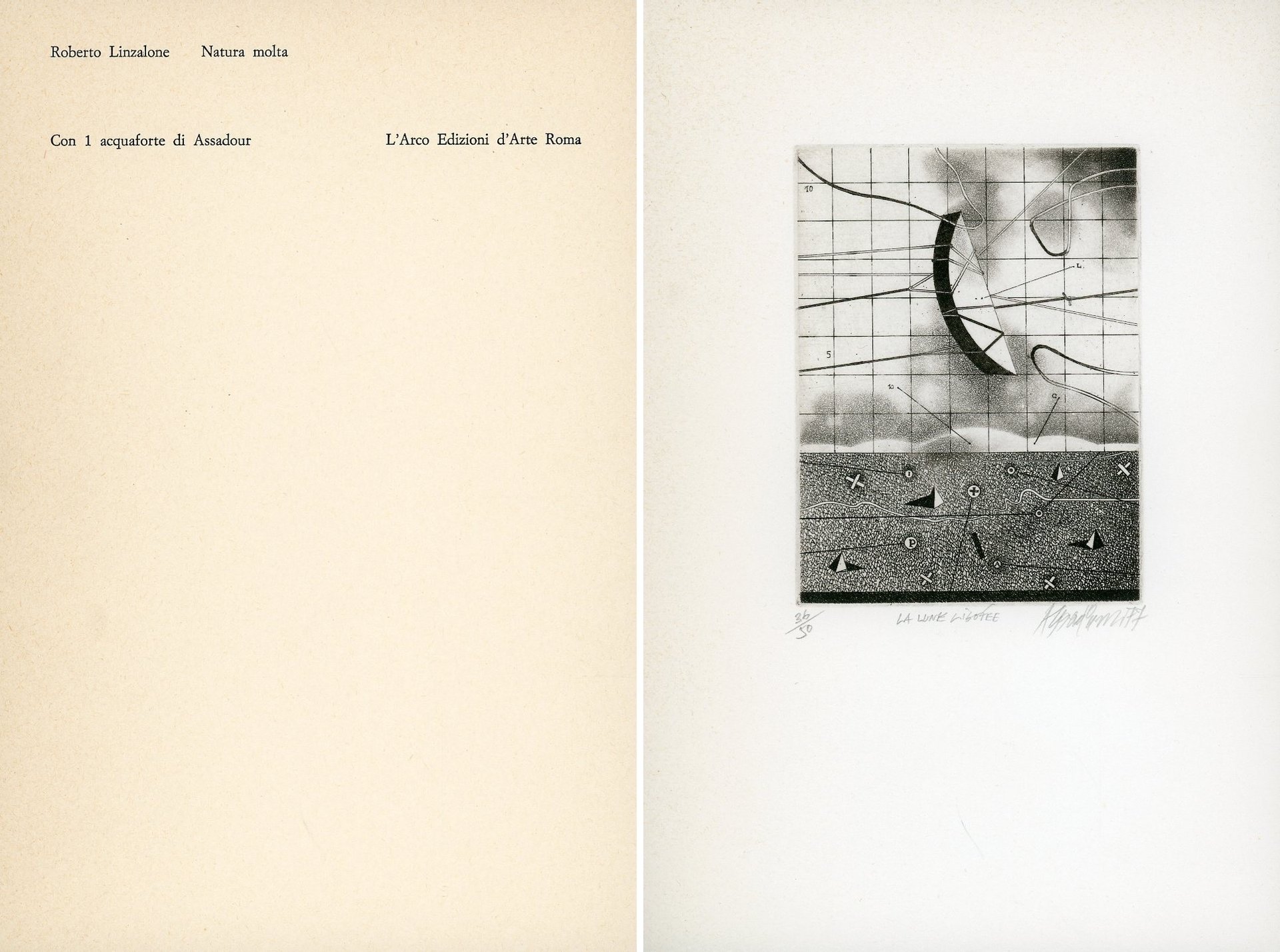 Un poemetto di Linzalone e una acquaforte originale, numerata e firmata di Assadour (cm 12x9). Edizione a cura di Giuseppe Appella Quartini sciolti. Incisione impressa a Parigi da Claude Groschéne su carta Rives. Testo stampato dalla Sti (Società Tipografica Italia). Es. 36. 8vo. pp. 20. . Ottimo (Fine). . Edizione originale di 50 es. numerati. .