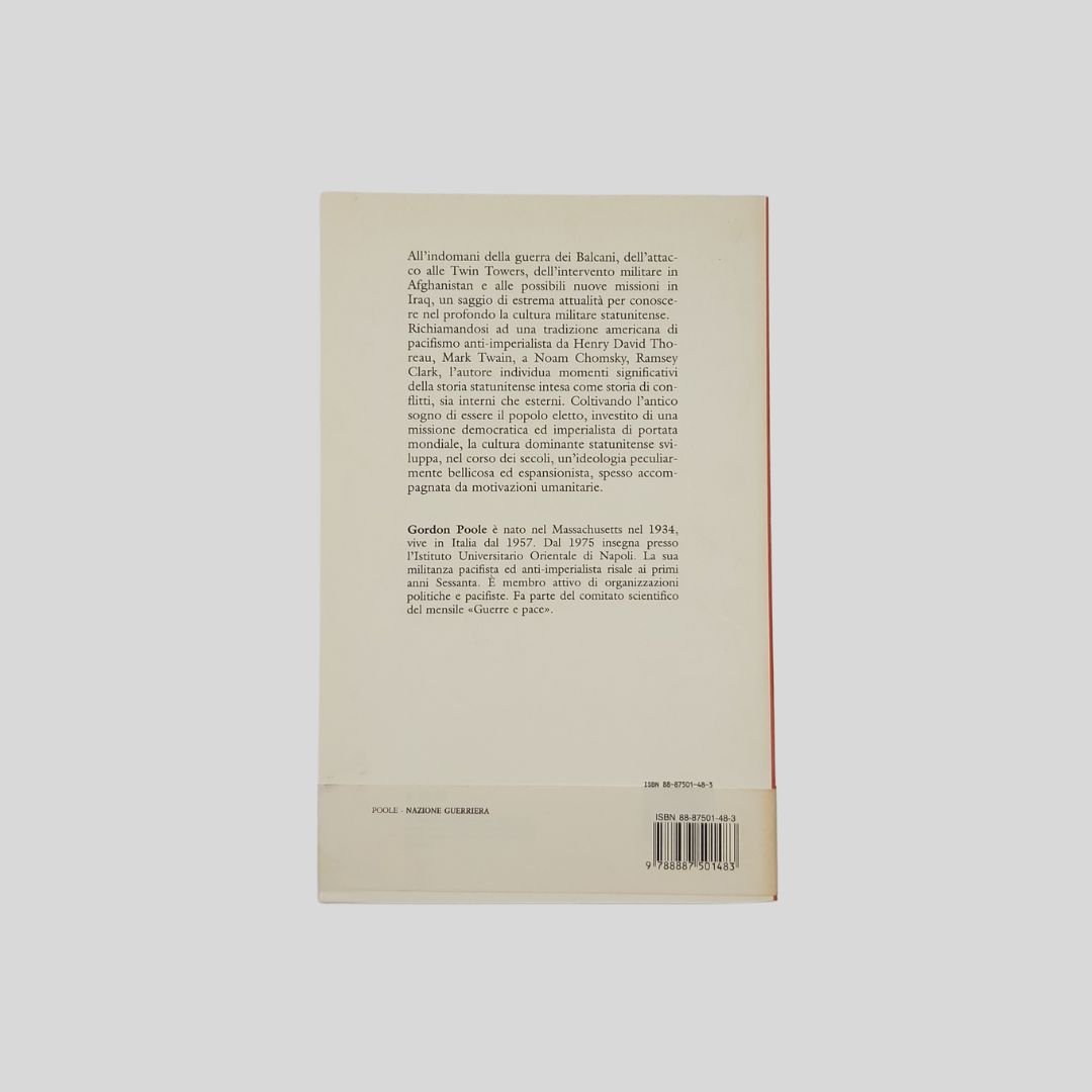 In-8, pp. 174. Seconda edizione. Con fascetta editoriale: Premio 2003 «Vittoria Giuliani Sostegni. I diritti e le lotte per la Libertà». In ottime condizioni di conservazione. Come nuovo. Scritto nel 2001 Nazione guerriera di Gordon Poole, in questa rara seconda edizione, è un testo ancora attuale. Un testo scritto e pubblicato nel 2001, in seconda edizione. All’indomani della guerra dei Balcani, dell’attacco alle Twin Towers, dell’attacco all’Afghanistan e all’Iraq, un saggio di estrema attualità per conoscere nel profondo la cultura militare statunitense. Gordon Poole analizza con lucidità critica la politica estera USA, mettendo in luce le radici culturali di un modello militare spesso interventista ed espansionista. Il volume affronta il rapporto tra strategia geopolitica e narrazione umanitaria, mostrando come le operazioni militari vengano frequentemente presentate come missioni di difesa della libertà e dei diritti. Un testo che, a distanza di anni, conserva una sorprendente attualità e aiuta a comprendere le dinamiche dei conflitti contemporanei e dell’equilibrio globale. Indice: Introduzione alla seconda edizione – Introduzione alla prima edizione – La fortuna del concetto di “popolo nemico” – Herman Melville e la guerra totale – Parla “Alce Nero” di Neihardt – Imperialismo e pacifismo di fine Ottocento – Dalla guerra contro il nazismo alla bomba atomica – Il dopoguerra prefigurato ne “I nudi e i morti” di Norman Mailer – 1946: La rivolta della truppa – I combattenti raccontano il Vietnam – Operazione “Tailwind” – Strage di Stato a Waco, Texas – Terre, carbone e popoli nativi – La guerra del 2000 – Bibliografia. Gordon Poole è nato nel Massachusetts nel 1934, vive in Italia dal 1957. Ha insegnato all’Istituto Universitario Orientale di Napoli. La sua militanza pacifista e anti–imperialista risale ai primi anni Sessanta. È membro attivo di organizzazioni politiche e pacifiste. Fa parte del comitato scientifico del mensile “Guerre e pace”