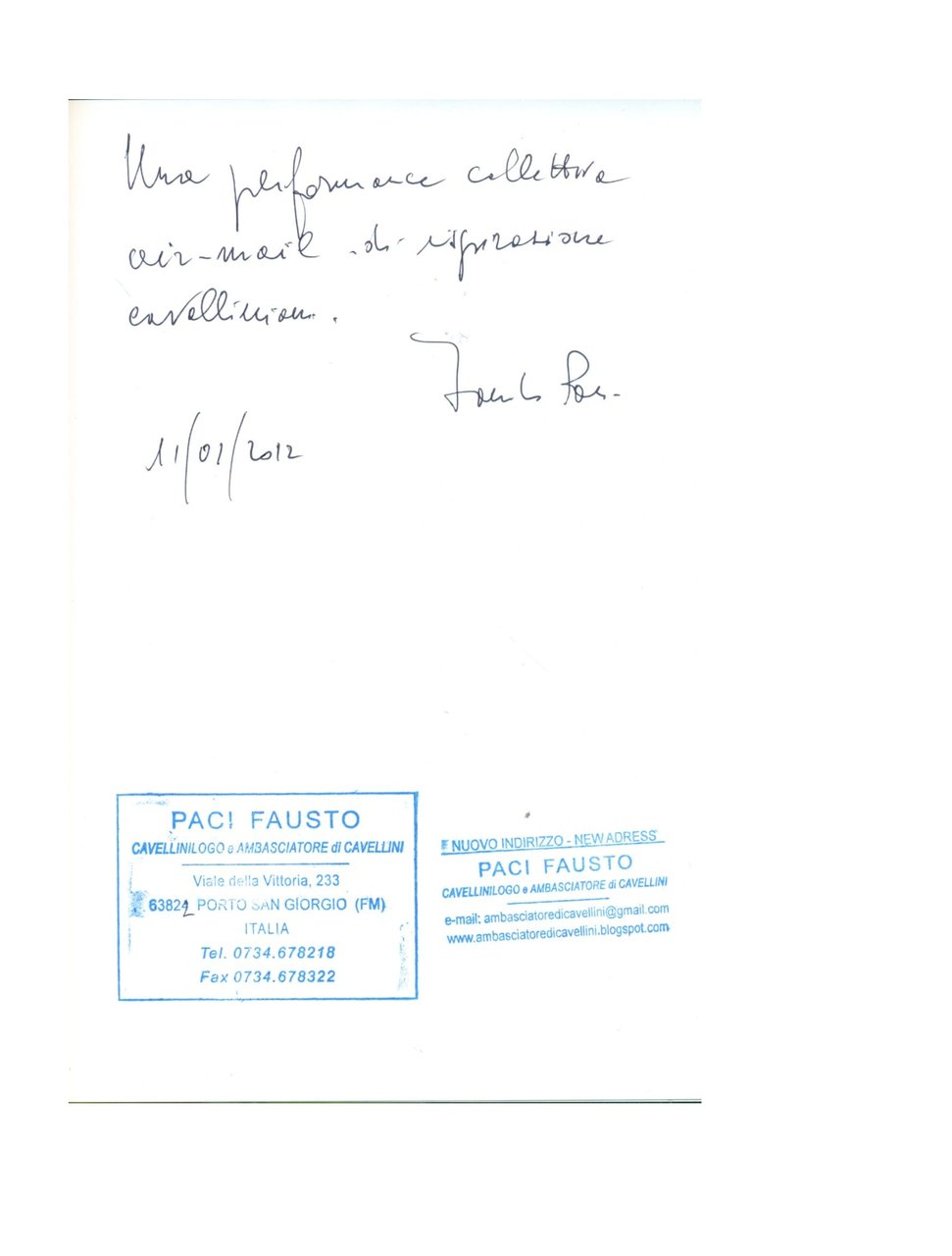 "Una mia operazione di taglio cavelliniano è stata molto apprezzata da vari mail-artisti. Si tratta di questo:  Io sono un "avioallergico" al contrario del grande GAC che ha svolto molte delle sue performance in tanti luoghi. E allora faccio arrivare, grazie a compiacenti amici che svolazzano qua e la per il mondo, delle cartoline, con le silhouette di GAC e mia, con la mia firma, quella loro e di altri occasionali. Quando mi sarò stancato di gironzolare, pur stando fermo al mio Paese, con questa che mi piace definire una performance collettiva "air-mail"  farò una composizione intitolata "non ci sono mai stato" (dalla introduzione di F.Paci)