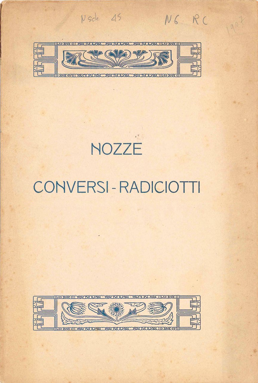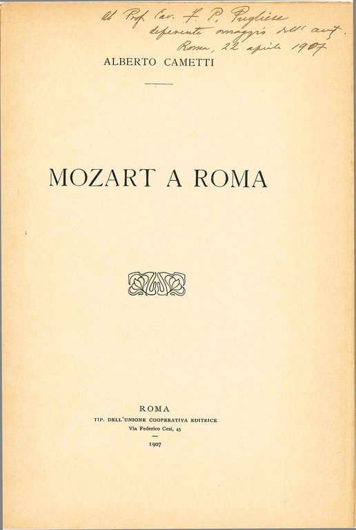 Mm. 248 x 168. Pp. 28, [3 bianche]. Brossura coeva leggermente brunita, con titolo color blu entro fregi geometrici e floreali. Dedica manoscritta dell'autore che dona l'esemplare al Prof. Cav. F. P. Pugliese. Dedica a stampa agli sposi Alessandro Conversi ed Amina Radiciotti per felicitarsi delle nozze celebrate a Roma in data 20 aprile 1907, da parte di Alberto Cametti, organista e maestro di cappella, direttore d'orchestra, compositore, storico della musica, membro della Commissione pontificia di arte musicale sacra, accademico di S. Cecilia e dell'Arcadia. Segue il trattato da lui scritto, intitolato Mozart a Roma e corredato di immagini (Casa abitata da Mozart nel 1770 da una stampa del Vasi; Ritratto di W.A. Mozart dipinto da P. Batoni in Roma nel 1770; Aspetto attuale del palazzetto Scatizzi in piazza Nicosia).