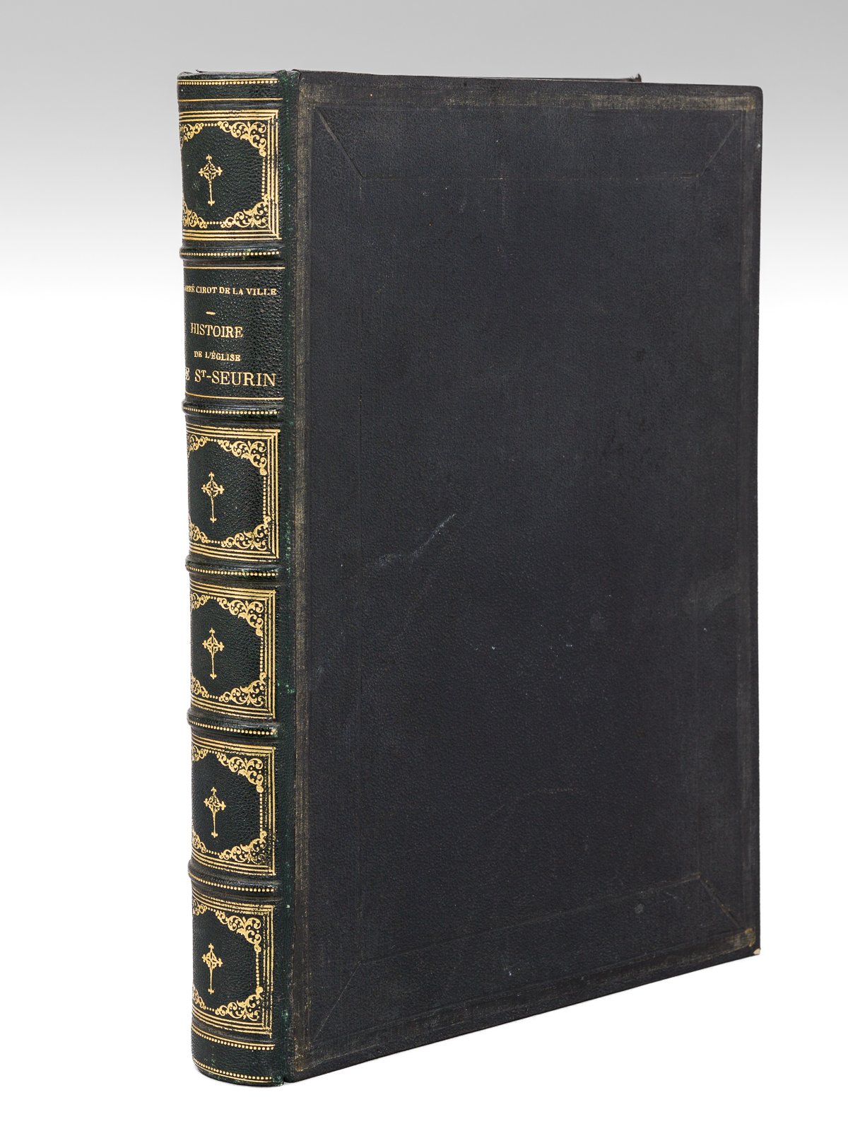 1 vol. in-4 reliure de l'époque demi-chagrin vert, dos à 5 nerfs dorés orné, Typographie Ve Justin Dupuy et Comp., Bordeaux, 1867, 2 ff, IV-450 pp. et 1 f. avec 13 planches hors texte (dont une reproduction photographiques et eaux-fortes) Bel exemplaire de cet important ouvrage, illustré de 13 belles planches hors-texte, avec plusieurs superbes eaux-fortes, certaines signée de Léo Drouyn, mais aussi du Baron de Marquessac, de Verneilh, etc. Peu commun en aussi bel état en reliure d'époque (une petite annotation ancienne en page de titre corrige le titre de Jean-Pierre-Albert Cirot de la Ville d'abbé en "Mgr"). Une superbe étude de référence sur le plus beau et l'un des plus anciens sanctuaires de Gironde.