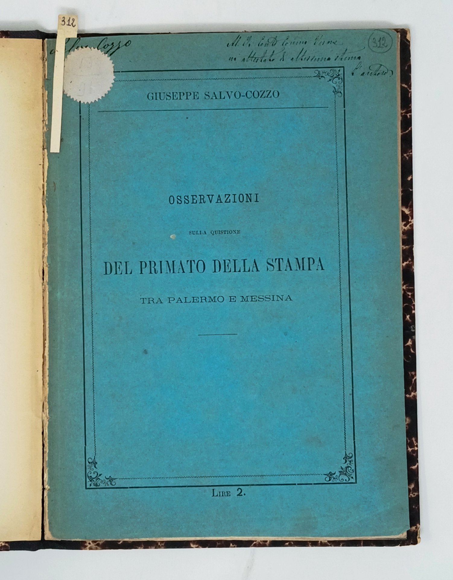 Osservazioni sulla quistione del primato della stampa tra Palermo e Messina. | Libri antichi e moderni | SALVO-GOZZO, Giuseppe.