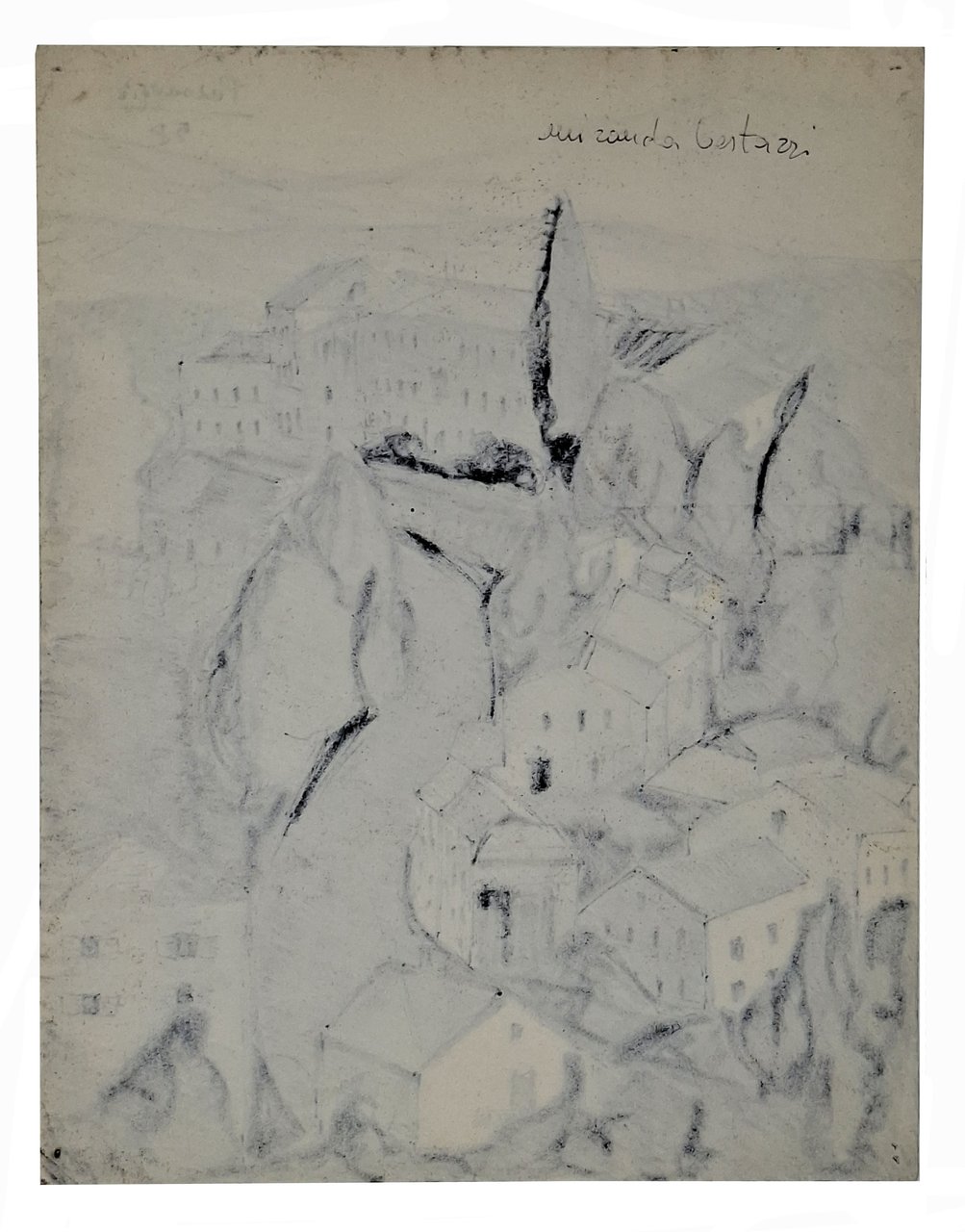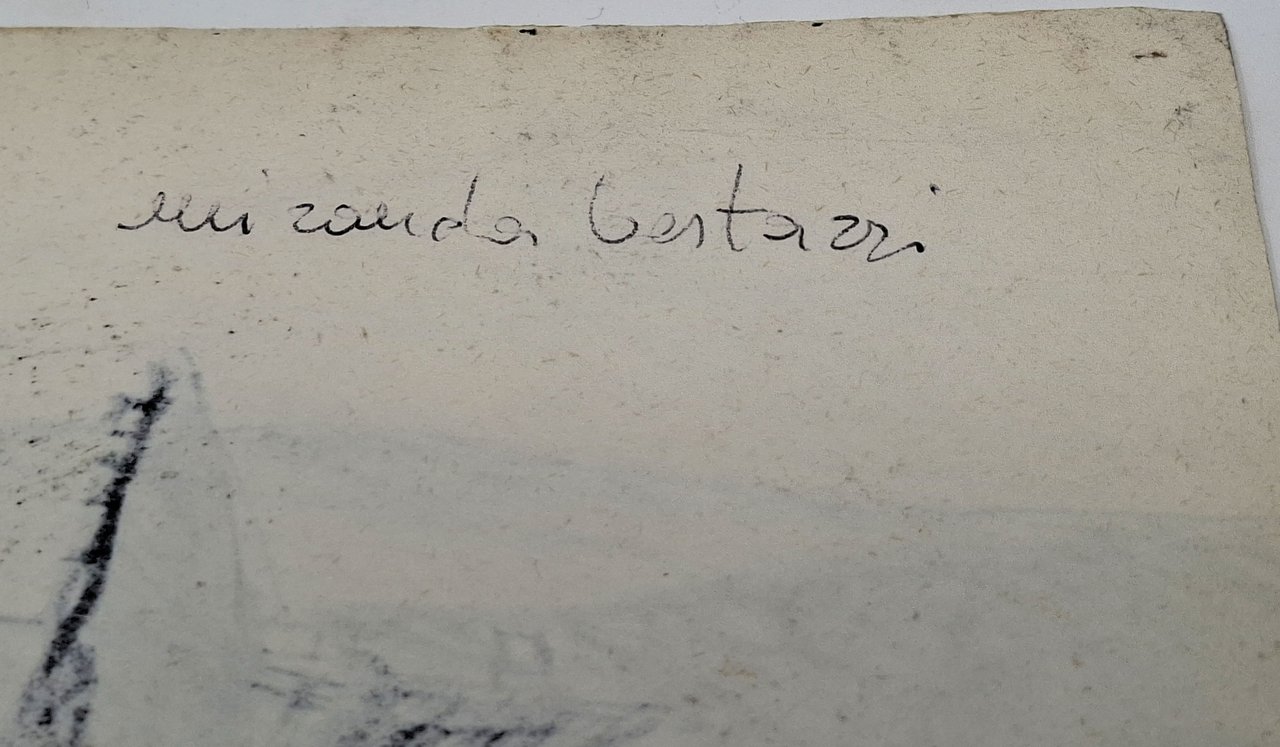 su un foglio da disegno in carta sottile, di dimensioni 22 x 28 cm circa, è stato realizzato, con tecnica mista (presumibilmente pastello e pennarello), un bel paesaggio. In alto a destra è presente il titolo 'Paesaggio' e la data ('58') a pennarello. Sul retro del foglio è presente il nome completo dell'artista: Miranda Bestazzi (1931 - 1973), pittrice e smaltatrice italiana, attiva principalmente nel torinese e nel cuneese, nell'ambito della 'Comunità Artistica' fondata da Idro Colombi. La sua produzione comprende dipinti e, in modo significativo, smalti su rame, spesso realizzati in collaborazione proprio con Idro Colombi negli anni '60. L'artista è ricordata come una delle figure femminili che hanno contribuito alla rinascita dell'arte dello smalto a Torino nel secondo dopoguerra. E' ricordata, per altro, la sua presenza in contesti storici artistici legati a Dronero e al Museo Mallè. Stato di conservazione: minuscoli forellini sui quattro angoli del foglio (presumibilmente l'opera in passato era stata affissa a qualche supporto) ma disegno originale decisamente ben conservato. Senza cornice. L'opera in vendita fa parte di un'insieme di opere originali di Miranda Bestazzi, in nostro possesso.