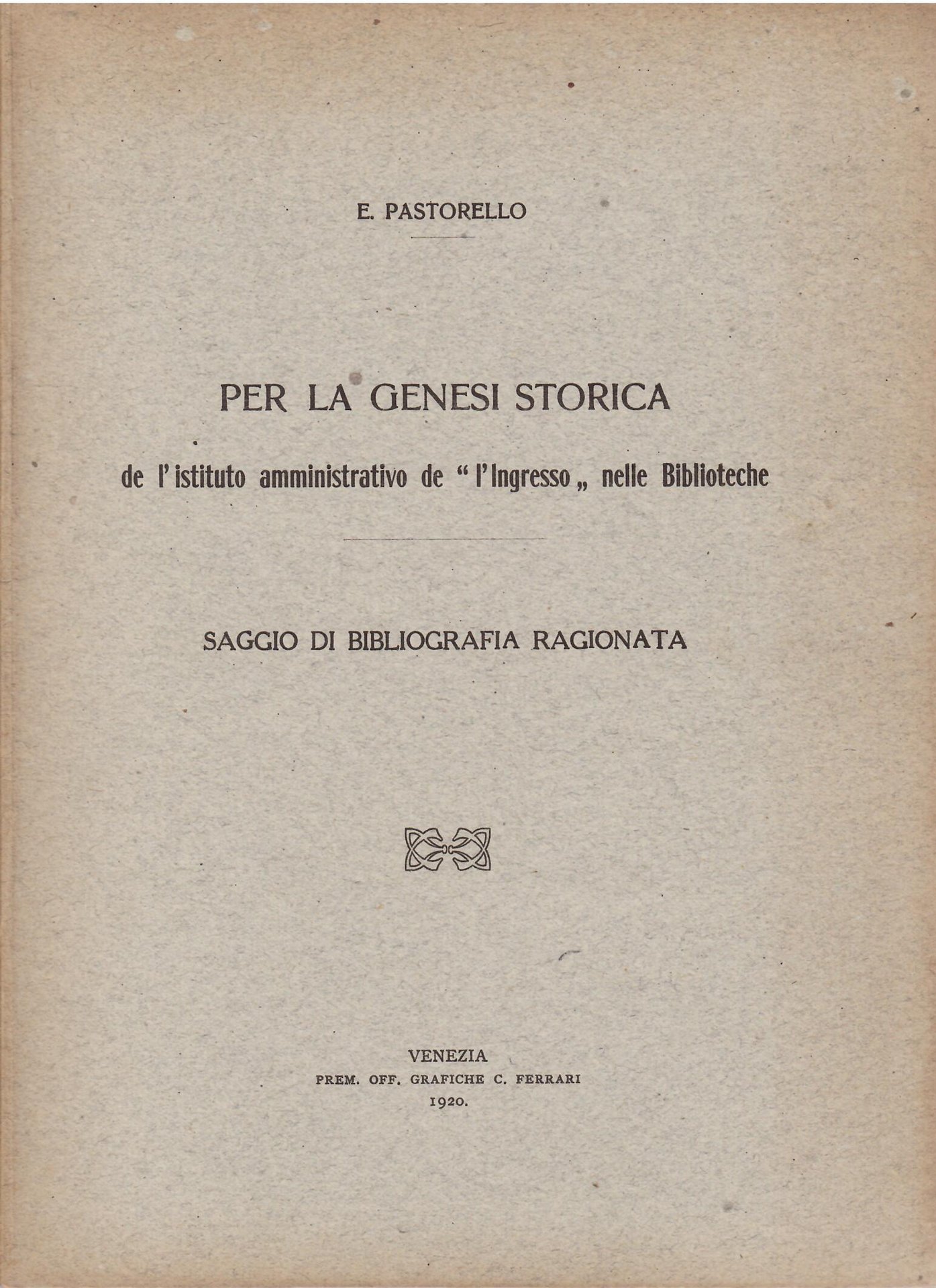 PER LA GENESI STORICA DE L'ISTITUTO AMMINISTRATIVO DE " L'INGRESSO " NELLE BIBLIOTECHE | Libri antichi e moderni | E. Pastorello