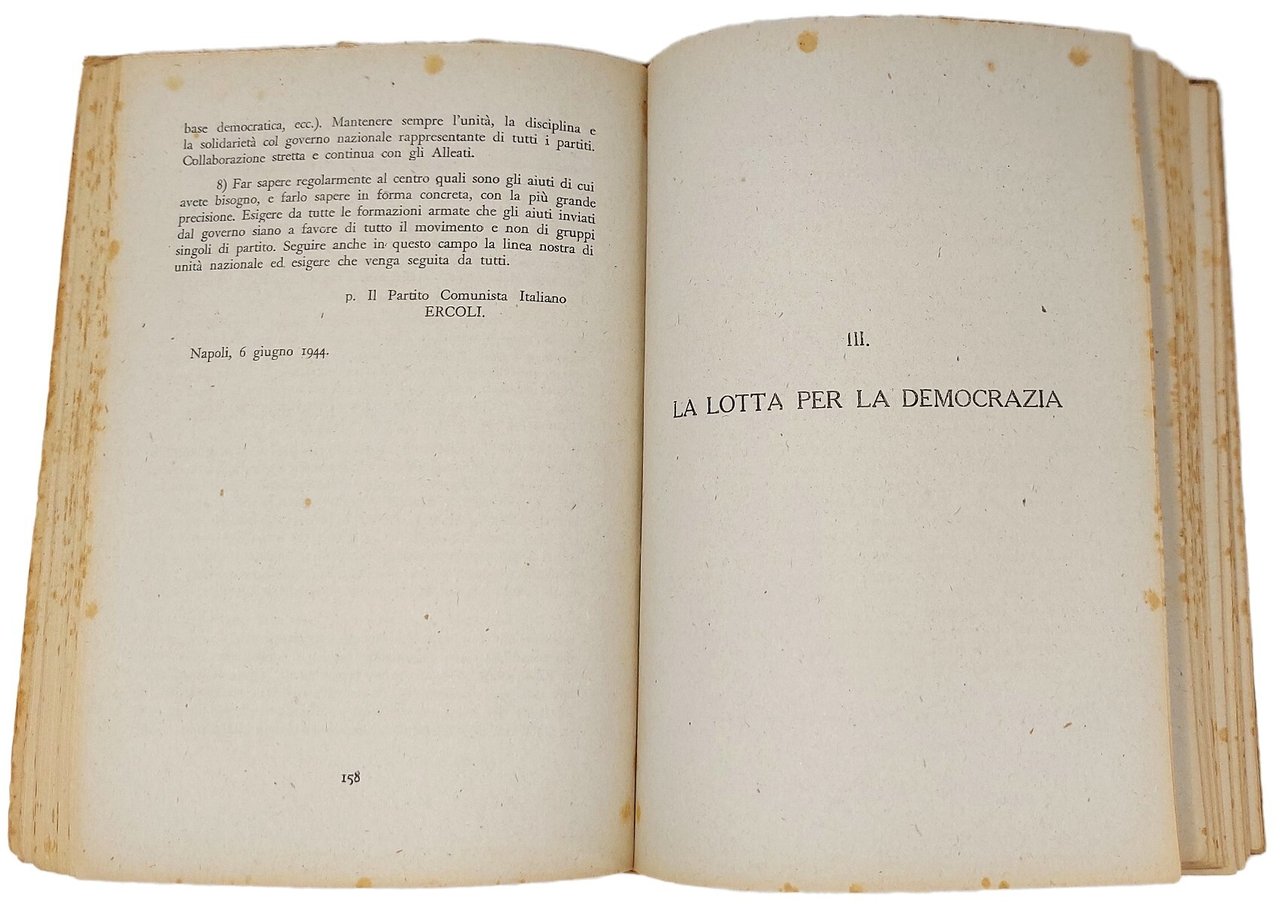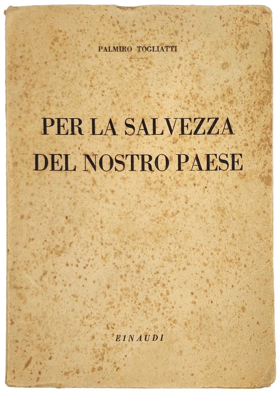 >in-16, pp. 424, brossura editoriale. Edizione originale delle testimonianze politiche di P. Togliatti, leader del Partito Comunista Italiano, nel turbolento periodo storico 1941-1945, suddivise in capitoli: 1) Dal microfono di Radio Mosca, 27 Giugno 1941- 7 Maggio 1943. - 2) La svolta di Napoli. - 3) La lotta per la democrazia. - 4) I partiti. - 5) Politica estera. - 6) Polemiche. - Raro e importante volume, non citato da varie bibliografie storiche, politiche e letterarie del '900, il secondo libro da lui scritto dopo ''Politica Comunista'' del 1945. (P.Togliatti, Genova 1893-Artek 1964, iniziò la vita politica nel 1919, collaborando con Gramsci, Terracini e Tasca; fu fondatore del PCI nel 1921 al Congresso di Livorno. Nel Congresso del 1931 lanciò la parola d'ordine della lotta al fascismo con tutti i mezzi e su tutti i fronti. Esule in Unione Sovietica dal 1940 all'aprile 1944, dopo il rientro in Italia svolse una fondamentale attività politica in favore della sinistra italiana. Esemplare con fioriture sparse, più pronunciate sulla brossura. Cat. Ediz. Einaudi fino al genn. 1956, p. 176. Diz. Mondadori di St. Universale, II, 1110.