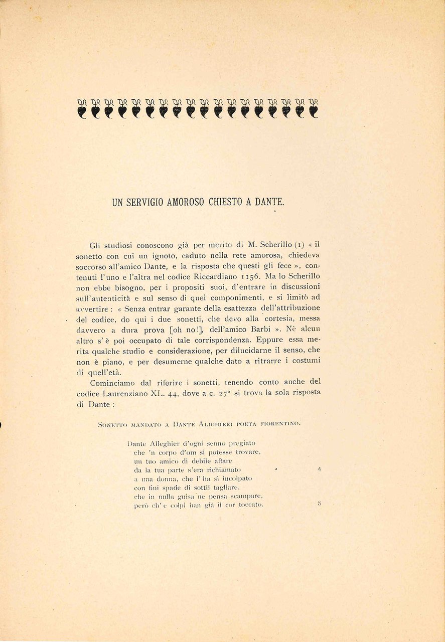 In 8vo (mm. 280 x 194). Pp. 20. Brossura coeva, leggermente brunita e con fioriture, rilegata con cordoncino visibile. Dedica alla sposa Silvia Mazzoni, da parte degli amici di lunga data Barbi e Parodi. Seguono l'episodio dall'Odissea Ulisse riconosciuto da Penelope, tradotto da Ernesto Giacomo Parodi (Genova 1862 - Firenze 1923; filologo, glottogo, critico letterario, docente universitario) e la breve dissertazione intitolata Un servigio amoroso chiesto a Dante, scritta da Michele Barbi (Pistoia 1867- Firenze 1941; bibliotecario, professore universitario di letteratura italiana, senatore del Regno (1939), critico letterario e studioso di letteratura dantesca)