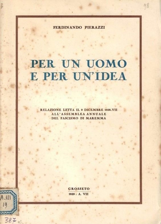 Per un uomo e per un'idea. Relazione letta il 9 dicembre 1928-VII all'assemblea annuale del fascismo di Maremma. | Libri antichi e moderni | Pierazzi Ferdinando.