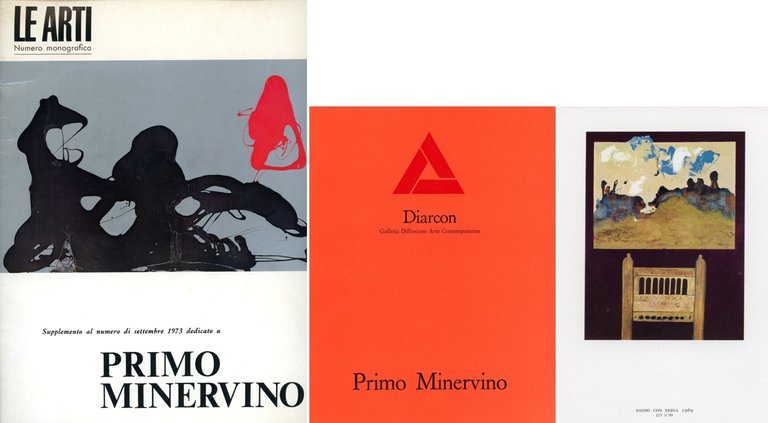 Plinio Minervino, Numero monografico della rivista Le Arti. testi di Luigi Carluccio, Giorgio Kaisserlian, Franco Russoli, Riccardo Barletta e altri. Con 36 illustrazioni a colori di cui alcune a piena e dopia pagina. Nota biografica con foto dell'Artista . 8vo. pp. 30. . Molto buono (Very Good). . . . Si aggiunge il Catalogo della mostra alla Galleria Diarcon, Milano 27 gennaio - 13 fabbraio 1972. Testo di Franco Passoni. Con 16 tavole in nero e a colori. Nota biografica