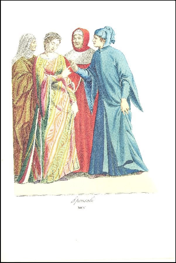 Numerose illustrazioni in bianco e nero nel testo e tavole a colori fuori testo tratte dall'opera di Camillo Bonnard, Costumi dei secoli XIII, XIV e XV ricavati dai più autentici monumenti di pittura e scultura, ecc. Milano 1832. Bibliografia . 8vo. pp. XIV + 118. . Ottimo (Fine). . . .