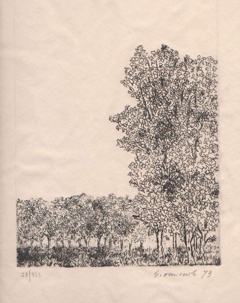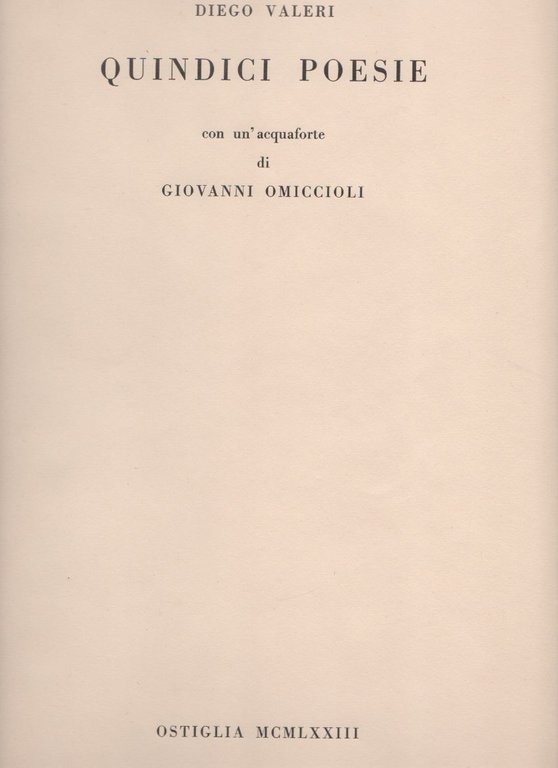 Quindici poesie inedite di Diego Valeri adorne di un'acquaforte di Giovanni Omiccioli numerata e firmata dall'artista (cm. 24x17,2) Testo inciso da Bruno Bassi di Revere; acquaforte tirata sui torchi mano di Nereo Tedeschi di Verona. Carta bianca a tino delle Cartiere Magnani di Pescia. Esemplare n. 28. 4to. pp. 28. . Molto buono (Very Good). Leggera ondulazione delle pagine dovuta alla qualità della carta. Edizione di 155 esemplari numerati. .