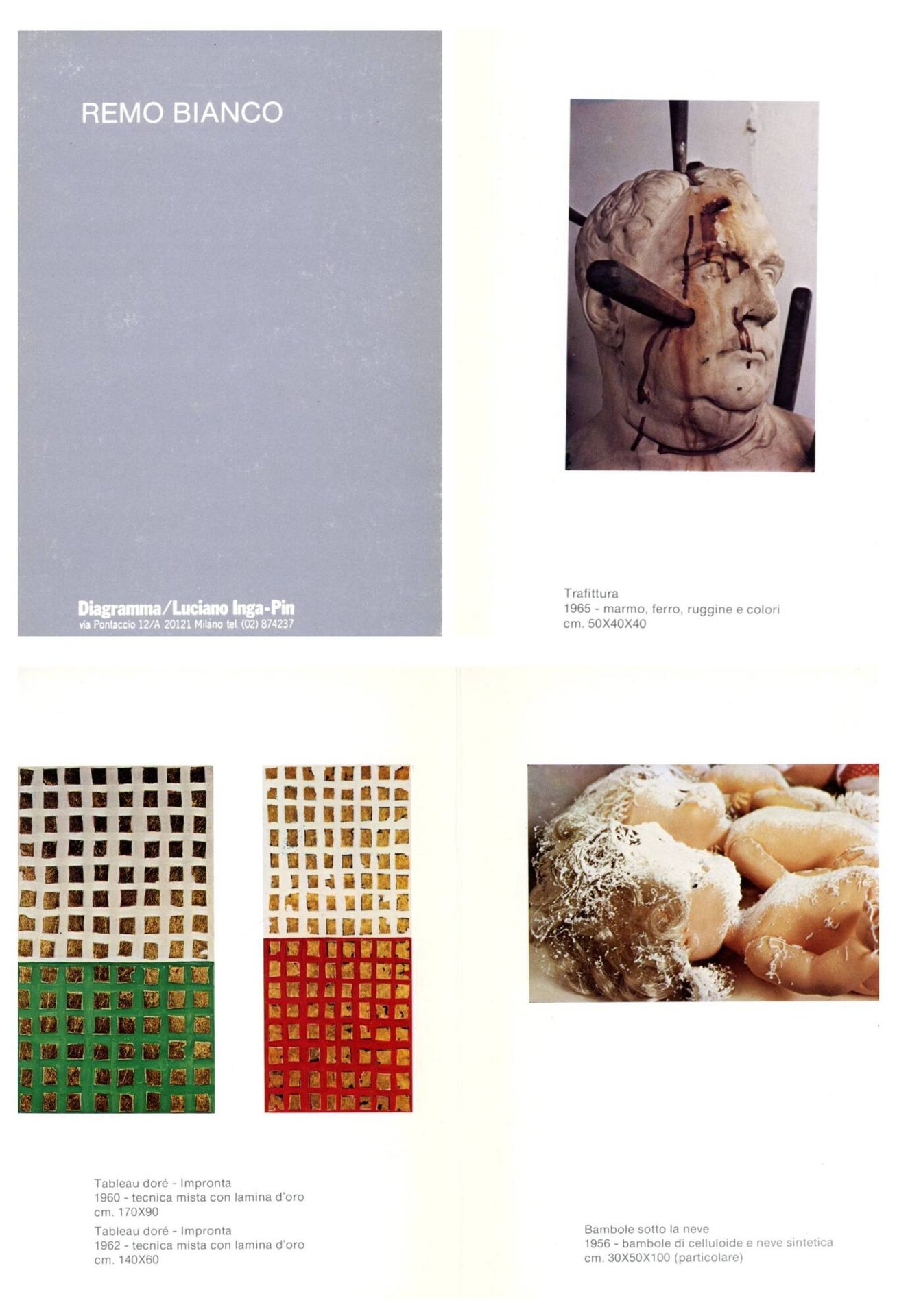Invito alla mostra preso la Galleria Il diagramma/Luciano Inga-Pin, Milano, 16 gennaio - 11 marzo 1986. La mostra consisteva nalla presentazione di tutta la produzione dell'artista Remo Bianco in quattro gallerie di Brera: Il Mercante, Vismara, Diagramma e Studio R. P. D'Ars . Cm 21x15,5. . . Ottimo (Fine). . . . Agli inzi la pittura di Remo Bianco fu essenzialmente figurativa, fortemente influenzata dall'espressionismo esistenziale di Rouault. Con gli anni Cinquanta i suoi interessi si rivolsero sempre più verso il movimento astrattista, avvicinandosi soprattutto al Movimento Nucleare, fondato nel 1951 da Sergio Dangelo ed Enrico Baj, ed allo Spazialismo di Lucio Fontana. Pertanto la sua pittura si allontana quasi completamente dalla figurazione per diventare una stratificazione di fili e pennellate, grumi di materia sempre più informi. Importante il suo viaggio negli USA dove ha modo di  conoscere l'espressionismo astratto e incontrare Jackson Pollock, da cui aprrende la tecnica del dripping che utilizzerà nei collages realizzati nel 1955.
