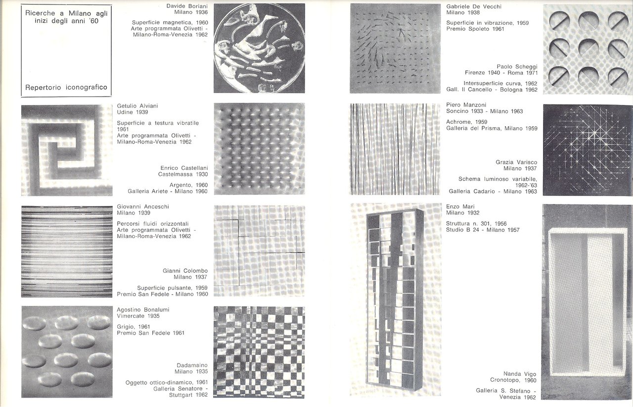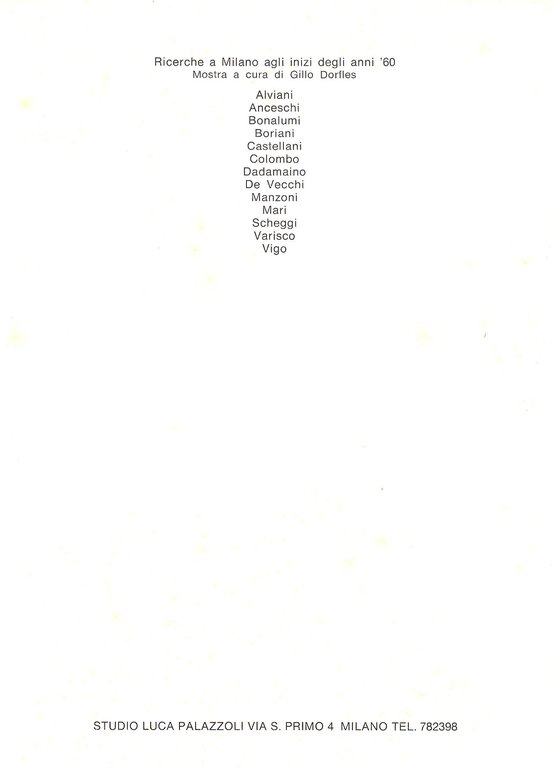 Plaquette della mostra alla galleria Studio Palazzoli di Milano. Gli artisti: Alviani, Anceschi, Bonalumi, Boriani, Castellani, Colombo, Dadamaino, De Vecchi, Manzoni, Mari, Scheggi, Varisco, Vago . 8vo. pp. 18. . Molto buono (Very Good). Fioriture leggere (Some light yellowing). . .