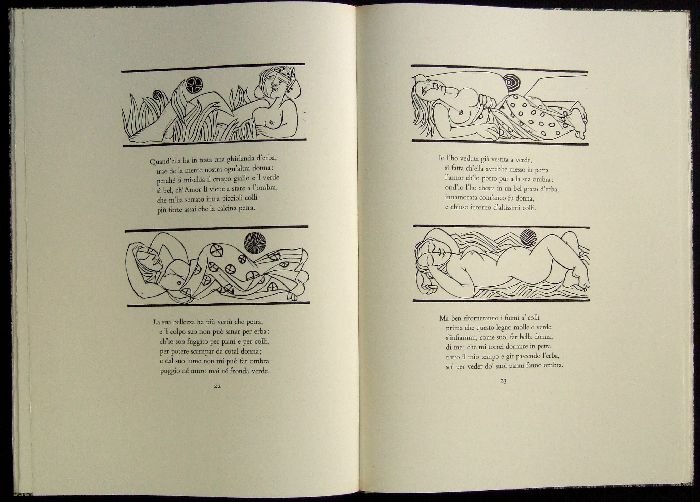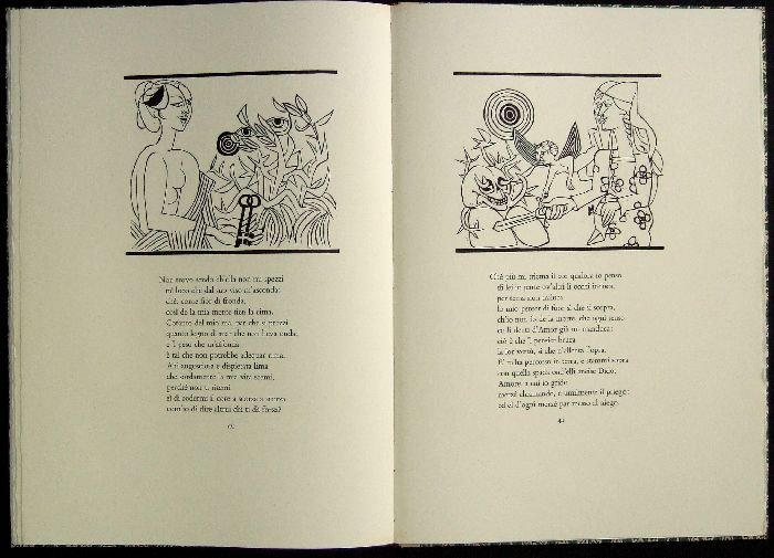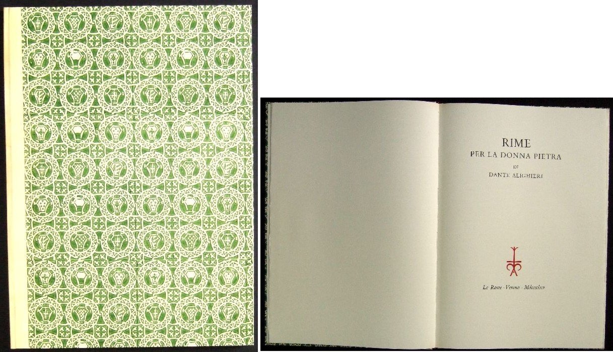 Le rime per la donna Pietra secondo la lezione fermata da Michele Barbi per la Società Dantesca Italiana, riveduta da Gianfranco Contini, con una nota di Gianlorenzo Mellini, sono illustrate con trenta incisioni originali in linoleum di Francesco Arduini (cm 17x20; 24x15). Edizione firmata da Arduini Titolo in oro al dorso. Testo composto in carattere Bembo, impresso su carta di Pescia dalla Stamperia Valdonega di Giovanni Mardersteig nel VII Centenario della nascita del Poeta. Esemplare n. 29. Folio (cm 49x35). pp. 50. . Ottimo (Fine). . Prima ed. di 125 es. numerati e firmati. .