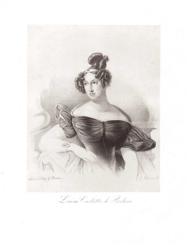 Ritratto litografico di cm. 22 x 17, più i margini. -(Maria Luisa Carlotta di Borbone-Parma, Barcellona, 2 ottobre 1802 – Roma, 18 marzo 1857, fu una principessa d'Etruria per nascita, per matrimonio fu principessa ereditaria di Sassonia, Principessa di Lucca.).
