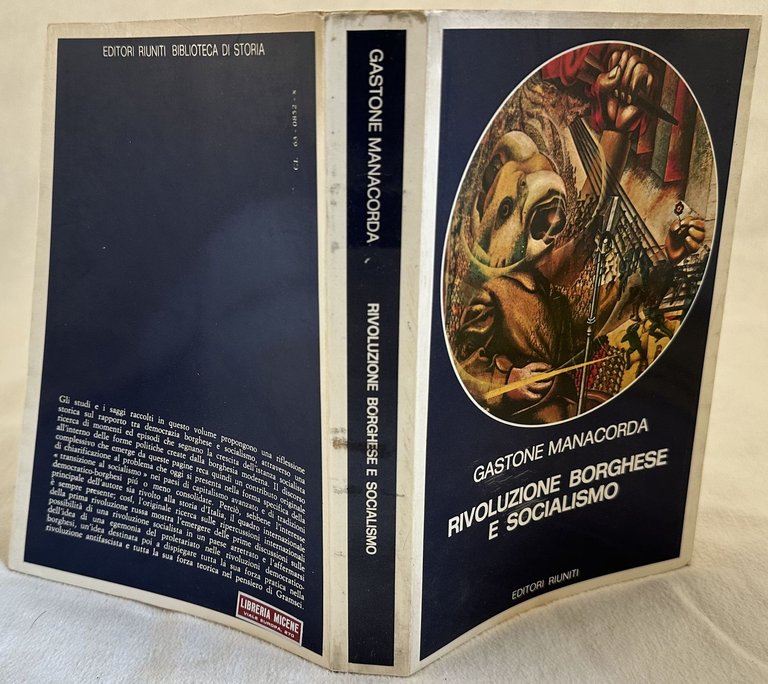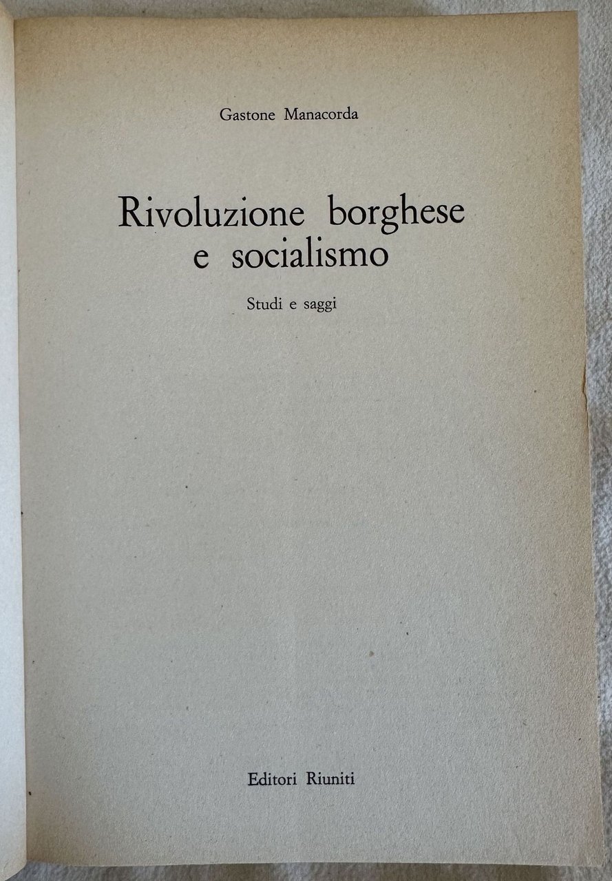 Prima edizione del 1975 di questo studio sulla rivoluzione borghese e socialismo di Gastone Manacorda. All'interno: Filippo Buonarroti, Lo spettro del comunismo nel Risorgimento, Sulle origini del movimento operaio in Italia; Profilo di Andrea Costa; Formazione e primo sviluppo del partito socailista in Italia; L'eco italiana della prima rivoluzione russa; Il generale Pelloux; Sturzo e Giolitti; Occidentalizzazione e rivoluzione nelle riforma di Kemal Ataturk; Le correnti della storiografia contemporanea al X Congresso di scienze storiche; Gli "Studi di storia" di Delio Cantimori; I caratteri specifici della storiografia dell'età contemporanea ecc. In ottime condizioni. Copertina editoriale in ottime condizioni generali con lievi usure ai margini e dorso. Legatura in buone condizioni. All'interno le pagine si presentano in ottime condizioni. In 8. Dim. 21,5x15 cm. Pp. 403.First edition of 1975 of this study about bourgeois revolution and socialism by Gastone Manacorda. Inside: Filippo Buonarroti, Lo spettro del comunismo nel Risorgimento, Sulle origini del movimento operaio in Italia; Profilo di Andrea Costa; Formazione e primo sviluppo del partito socailista in Italia; L'eco italiana della prima rivoluzione russa; Il generale Pelloux; Sturzo e Giolitti; Occidentalizzazione e rivoluzione nelle riforma di Kemal Ataturk; Le correnti della storiografia contemporanea al X Congresso di scienze storiche; Gli "Studi di storia" di Delio Cantimori; I caratteri specifici della storiografia dell'età contemporanea ecc. In very good conditions. Editorial cover in very good general conditions ightly worn in the extremities. Binding in good conditions. Inside pages are in very good conditions.In 8. Dim. 21,5x15 cm. Pp. 403.