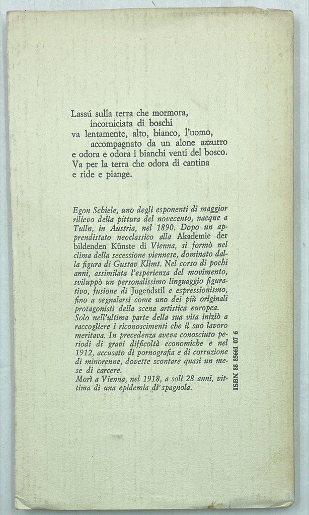 Brossura editoriale con risvolti, cm 21.5 x 12.5, pp 72 (2). Collana Resti, numero 3. Buono stato. Brevi componimenti e alcune lettere del pittore austriaco, con l’aggiunta del diario dal carcere (apocrifo pubblicato nel 1922 da Arthur Roessler); traduzione e note di Leonardo Quaranta. Edizione di 1010 esemplari.