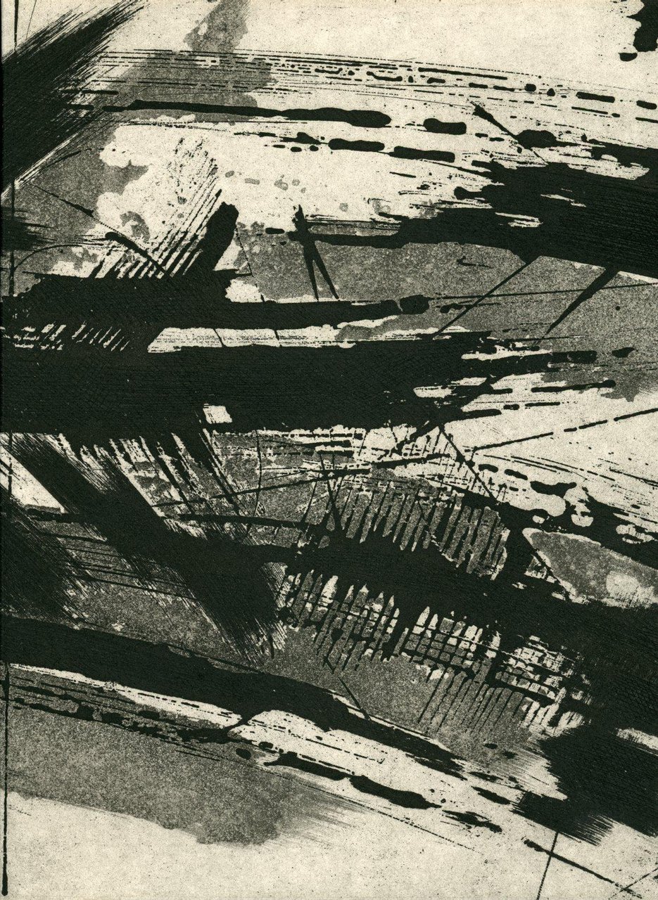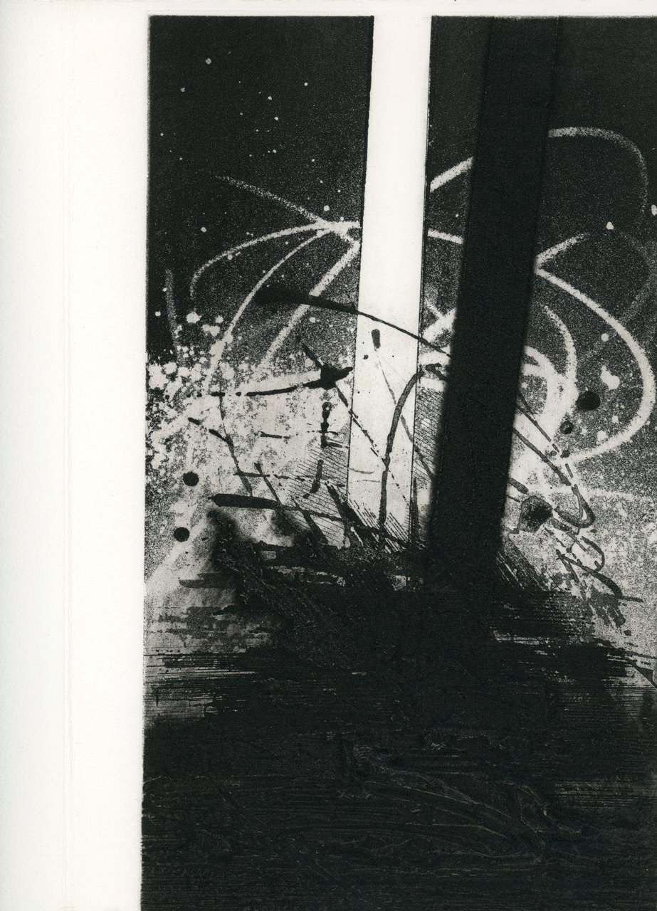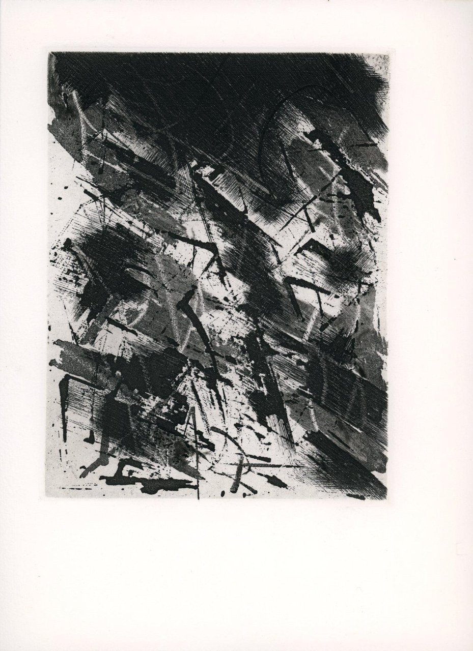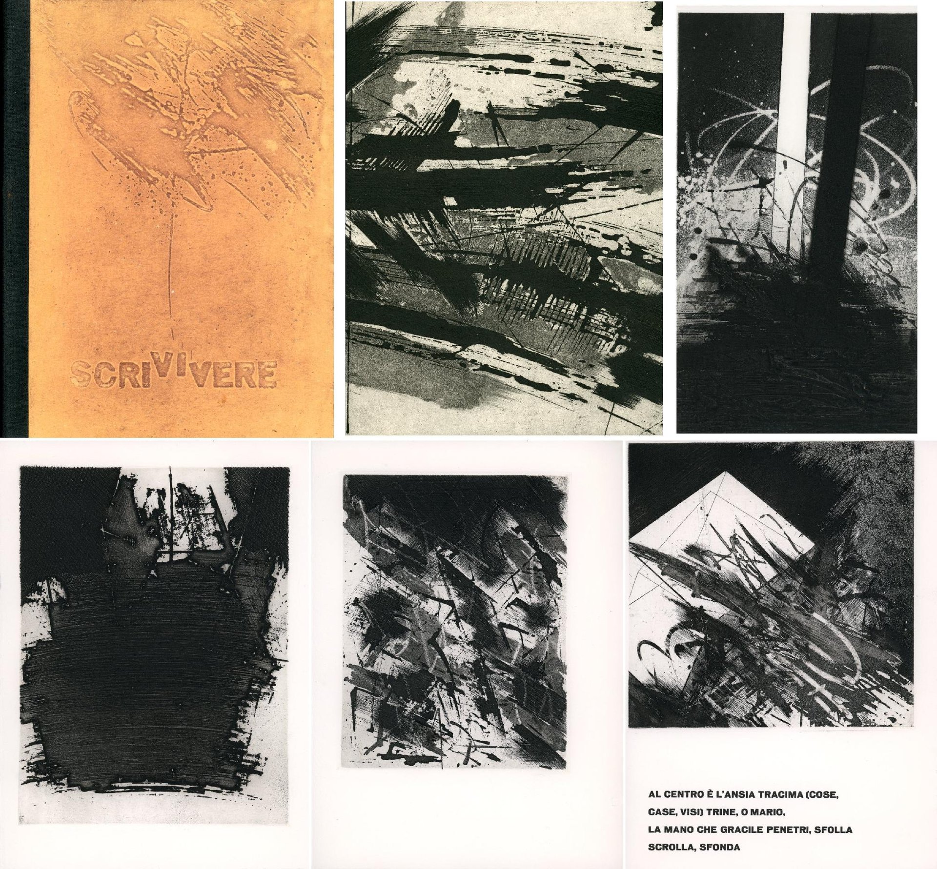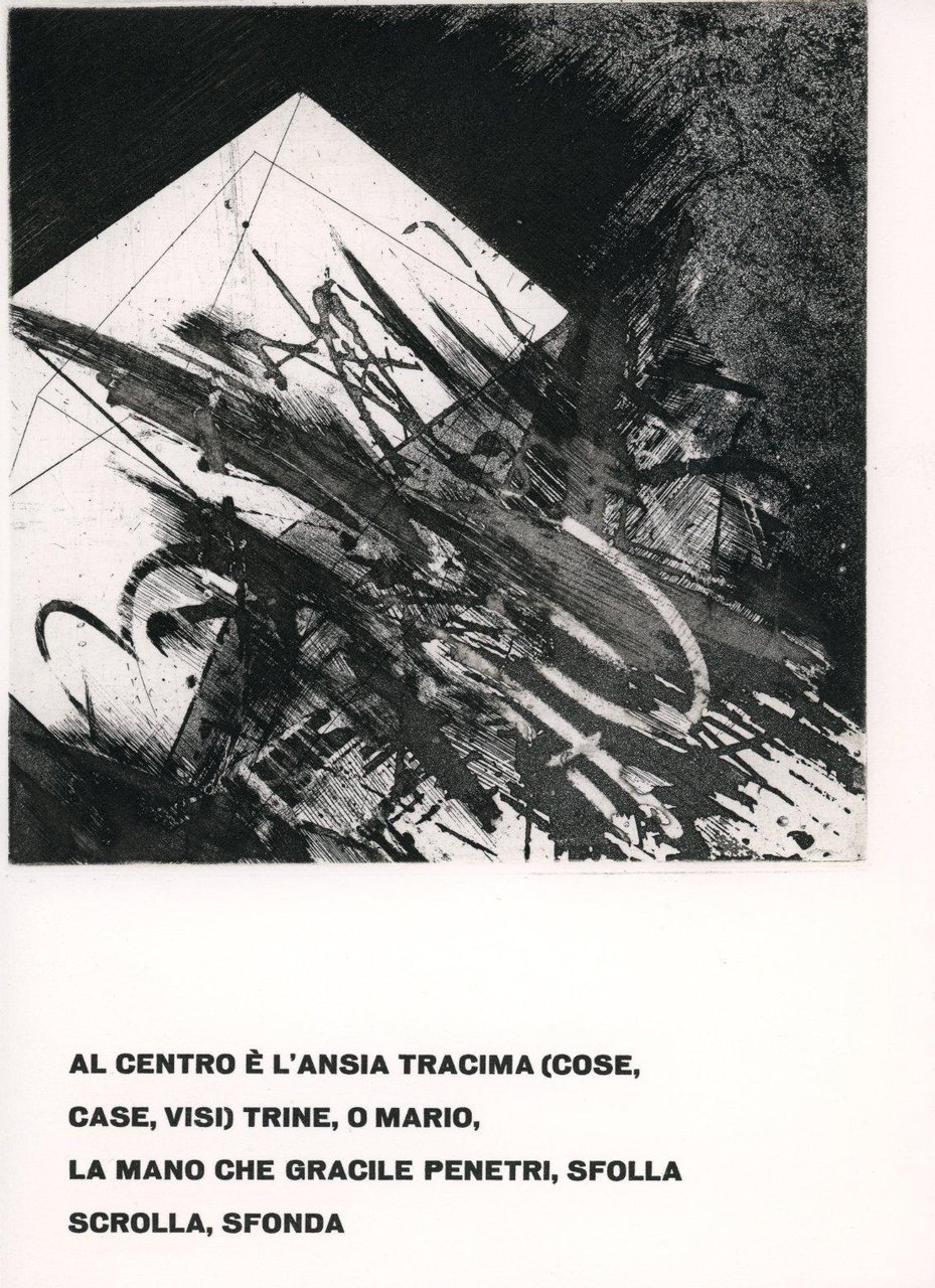 Poesie di Vincenzo Guarracino con 13 acqueforti acquetinte originali anche a doppia pagina di Mario Benedetti di cui 12 distribuite nel testo (da cm 18,5x21 a cm 27x19,5) e una per la copertina (cm 27x70). Edizione firmata da Benedetti e Guarracino Carta Hahnemuhle. Gli esemplari in numerazione romana costituiscono la suite delle acqueforti tirate su sei fogli a grandi margini numerati e firmati. Cm 27,5x20,5. pp. 48. . Ottimo (Fine). . Edizione di 70+XV es. numerati e firmati dagli A.. . Scri vi vere comprende poesie stampate negli spazi tra le acqueforti astratte che coprono le pagine. Lo scopo è quello di ottenere un equilibrio tra bianco e nero.