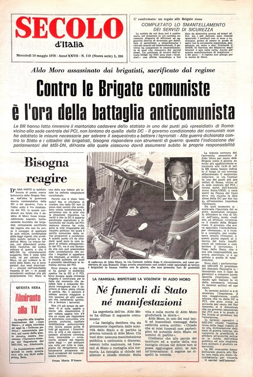 Quotidiano ufficiale del Movimento Sociale Italiano (MSI), pubblicato il giorno successivo al ritrovamento del cadavere di Aldo Moro in via Caetani: vi si accusa la Democrazia Cristiana di essere sotto ricatto del partito Comunista, e si invoca l'autorità militare per la tutela dell'ordine pubblico e la magistratura militare per il giudizio sui terroristi. Esemplare eccellente.