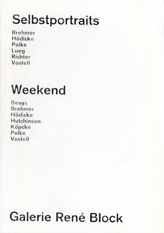 Selbstportraits: K. P. Bremer, K. H. Hodicke, Sigmar Polke, Konrad Lueg, Gerhard Richter, Wolf Vostell. Weekend: Joseph Beyus, K. P. Brehmer, K. H. Hodicke, Peter Hutchinson, Arthur Kopcke, Sigmar Polke, Wolf Vostell. Catalogo della mostra tenutasi presso la Galerie René Block, Berlino, 1972. Illustrazioni in bianco e nero . 16mo (cm 15x10,5). pp. 32. . Molto buono (Very Good). . Edizione originale di 1000 esemplari. .