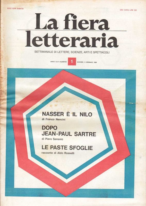Rivista formato 'Tabloid', cm. 40x28,5. Disponiamo dal n° 30 al 52 anno 1967 e dal n° 1 al n° 8 del 1968. Complessivamente 31 numeri, Tutte le prime pagine con disegno geometrico a coloro, pp. per numero, circa 32, con illustrazioni. Molti i nomi della letteratura e dell'arte appaiono con articoli, critica, poesie e racconti.