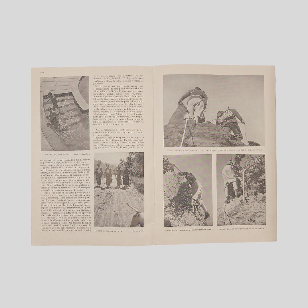 anno XLVII, n. 11, novembre 1941. Direttore: Carlo Bonardi. In-8, pp. 1242-1250, ripr. fotogr. interc. Copertina raffig. Ischia: La Pineta (da un acquarello di Alberto Miccichè). Riccamente illustrato, con numerose inserzioni pubblicitarie, anche a p. pagina. In buone condizioni. Carlo Linati, Sport popolari. Un ritratto letterario dell’Italia sportiva nel 1941. Carlo Linati, con la sua accattivante penna da paesista e ciclista dilettante, tratteggia magnificamente gli sport popolari: Ciclismo, Alpinismo, Bocce, Calcio, Canottaggio, Caccia, Tennis…tra Milano, il lago di Como e le cime del Sestriere. Altri contenuti: <BR><BR>TITTA ROSA G. – Le opere e i giorni<BR><BR>COZZANI Ettore – Le Cinque Terre<BR><BR>MANACORDA Guido – L’Italia nei poeti latini del Rinascimento germanico<BR><BR>SAPONARO MIchele – Leopardi a Pisa<BR><BR>DELOGU Raffaello – Primitivi spagnoli nella Pinacoteca di Cagliari<BR><BR>DOMENICHINI Ivo – Carbone e carbonai<BR><BR>Tra le inserzioni: Esso (a colori e a p. pagina), Italstrade, Campari, Impermeabili Pirelli, Telefunken, Croff, Borgogno, Luxardo, Lana gatto (a colori e a p. pagina)…