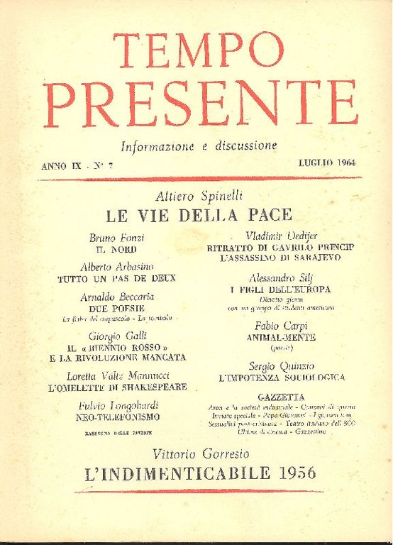 Direttori: Nicola Chiaromonte e Ignazio Silone. Scritti di Altiero Spinelli (Le vie della pace), Bruno Fonzi (Il Nord), Alberto Arbasino (Tutto un pas de deux), Arnaldo Beccaria (Due poesie: La fiaba del crepuscolo - La tombola), Giorgio Galli (Il biennio rosso e la rivoluzione mancata), Loretta Valtz Mannucci (L'omelette di Shakespeare), Fulvio Longobardi (Neo-telefonismo), Vladimir Dedijer (Ritratto di Gavrilo Princip - l'assassino di Sarajevo), Alessandro Silj (I figli dell'Europa. Diciotto giorni con un gruppo di studenti americani), Fabio Carpi (Animal-mente. Poesie), Sergio Quinzio (L'impotenza sociologica), Vittorio Gorresio (L'indimenticabile 1956) . 8vo. pp. 88. . Molto buono (Very Good). . . .