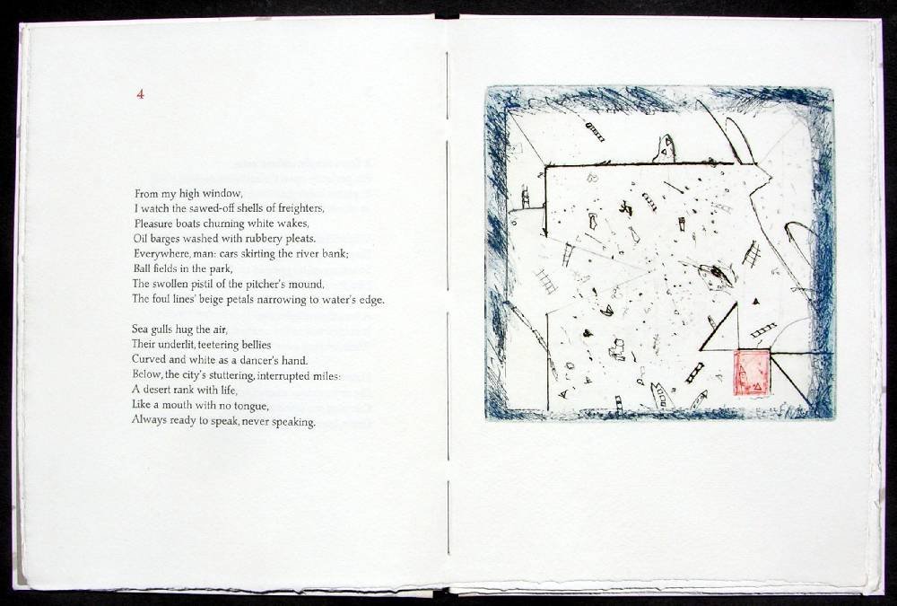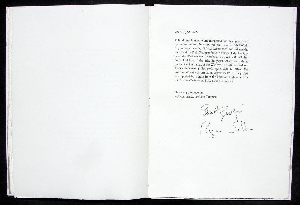 A poem by Paul Zweig whit etchings by Roger Selden. Una poesia di Paul Zweig e 2 incisioni a colori di Selden, di cui una in copertina (cm 16x16). Edizione numerata ad personam con firme autografe degli Autori Volume stampato su torchio a mano Washington del 1847 da Gabriel Rummonds e Alessandro Zanella. Carta creata appositamente per questa edizione presso la cartiera Wookey Hole Mill. Incisioni tirate da Giorgio Upiglio a Milano. Es. 33. 8vo. pp. 28. . Ottimo (Fine). Edizione numerata ad personam con firme autografe degli Autori. Prima ed. di 120 es. numerati e firmati. Rummonds - Plain Wrapper Press [Rummonds, 1999] Castiglioni Gino e Corubolo Alessandro, Un tipografo fra due culture. Richard-Gabriel Rummonds. Milano, Fondazione Biblioteca di Via Senato - Electa, 1999.