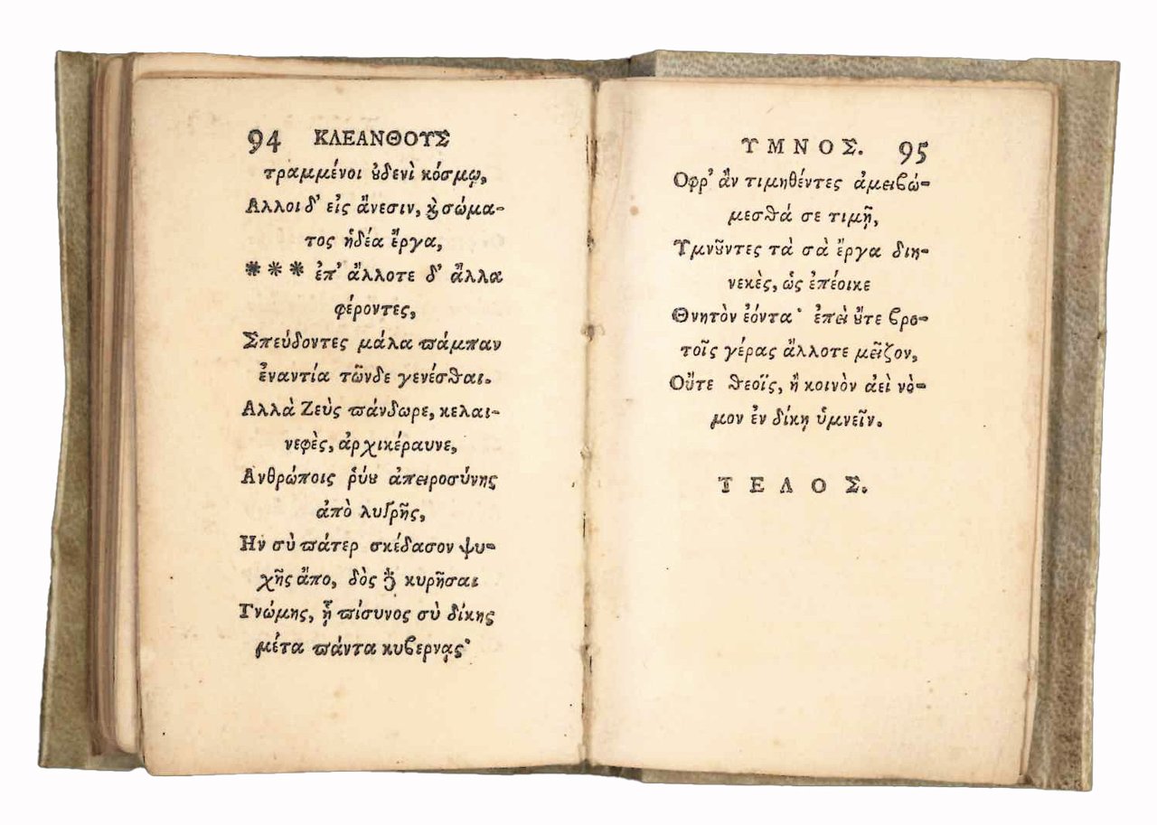 24mo (750x450 mm). 95, [1 blank] pp. Manuscript correction at p. 14. Late 19th-century vellum with overlapping edges. Very light browning, a good copy. The first miniature Foulis edition of Epictetus solely in Greek; a duodecimo edition in Greek and Latin was published in 1748.