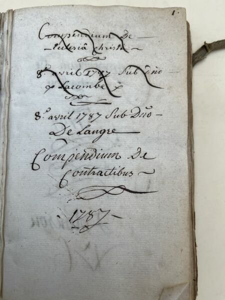 Sans éditeur 1787 Manuscrit, 1787. In-12 relié plein vélin à liens de 184 pages. Daté 8 avril 1787 Sub Dno (Subdivision ?) - De Langre. (probablement le nom de famille du rédacteur). Des annotations manuscrites, en français, sur une page de garde et sur la dernière page laissent à penser une origine soit de Rodez, soit de Toulouse. Entièrement en latin, très lisible. Bon état