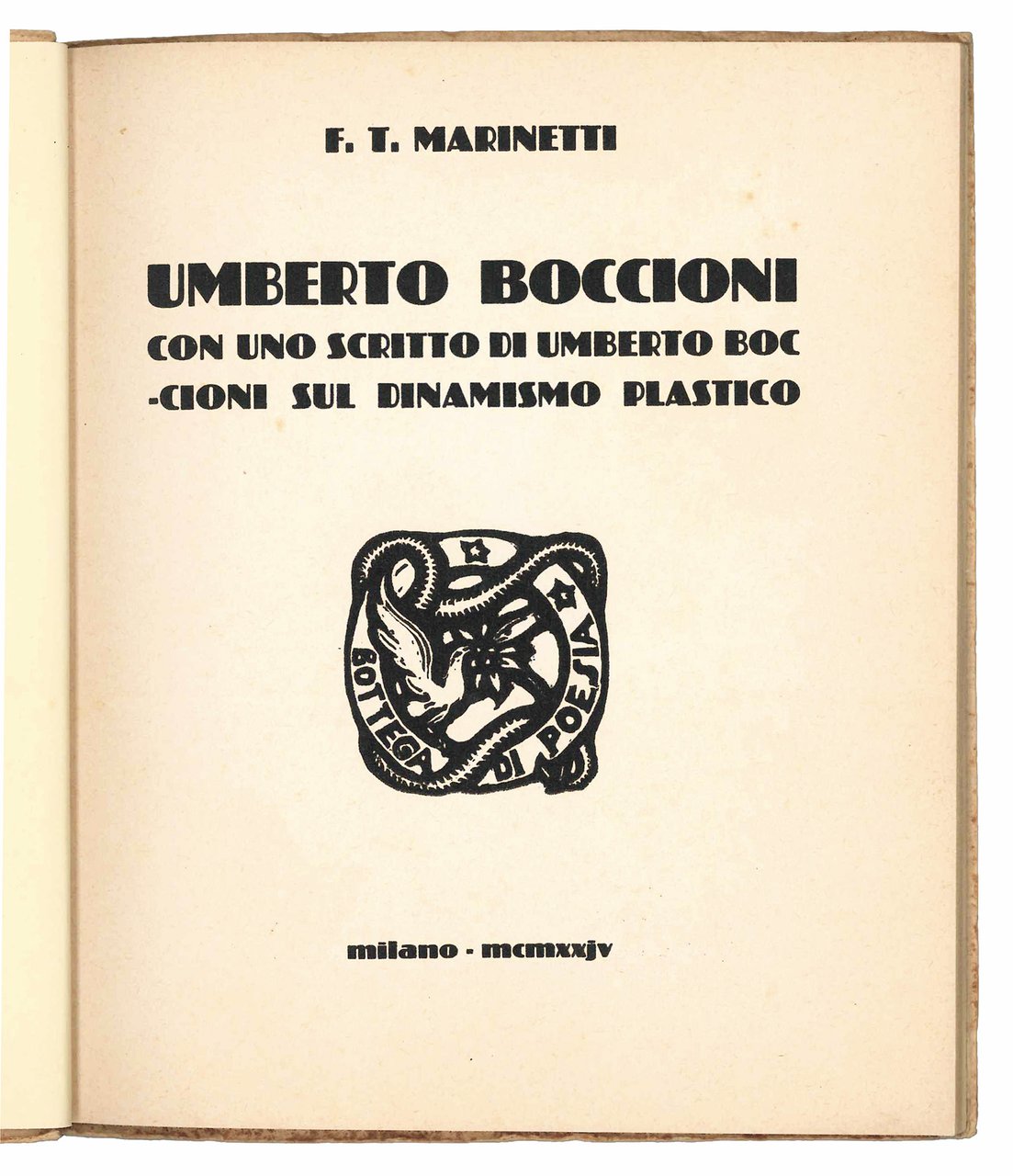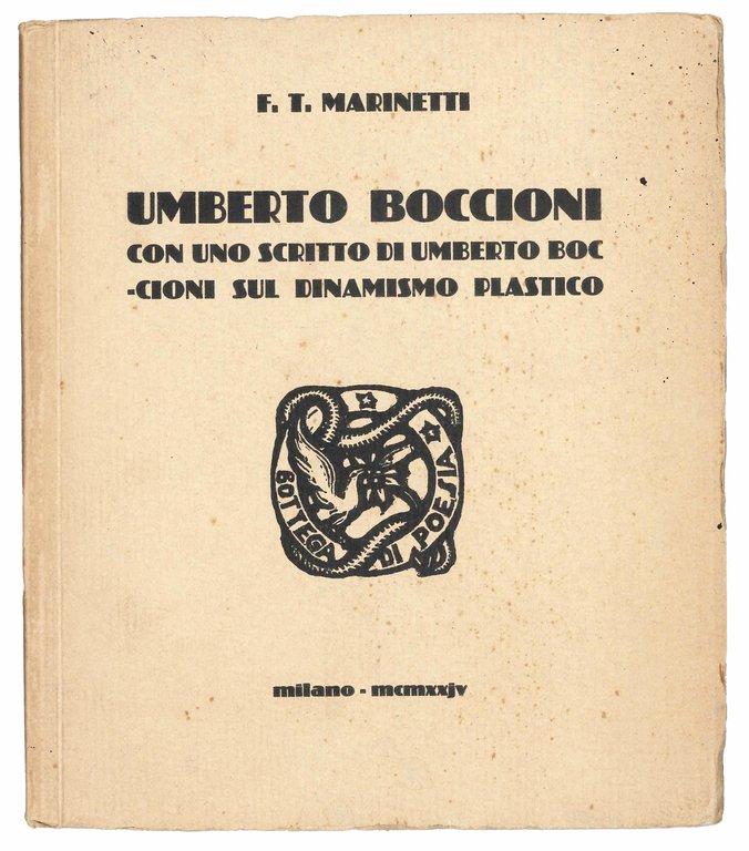 Prima edizione di questo catalogo monografico pubblicato in occasione di una retrospettiva boccioniana a Milano. Oltre ad un testo di Marinetti già apparso nel catalogo della mostra di Roma del 1922, il volume contiene anche un ampio testo di Boccioni e altri significativi scritti di Bontempelli, Notari e R. Simoni.