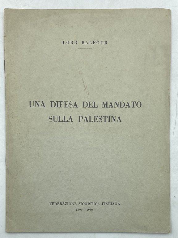 Opuscolo in brossura spillata, cm 21 x 15, pp 20. Opuscolo pubblicato in memoria di Lord Balfour, con la traduzione della Dichiarazione Balfour del 2 novembre 1917 (sulla creazione di uno stato ebraico in Palestina) e il discorso pronunciato alla Camera dei Lord il 21 giugno 1922.