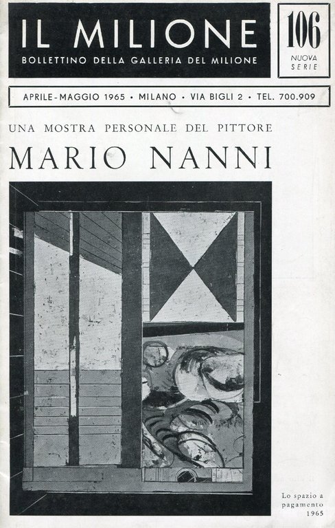 Brochure della mostra di Milano, Galleria Il Milione, aprile-maggio 1965. Testi di Renato Barilli ed Elda Fezzi. Due illustrazioni in bianco e nero . 8vo. pp. 8. . Buono (Good). Alone di ruggine in corrispondenza dei punti metallici (Spots of rust from staples along spine). . .