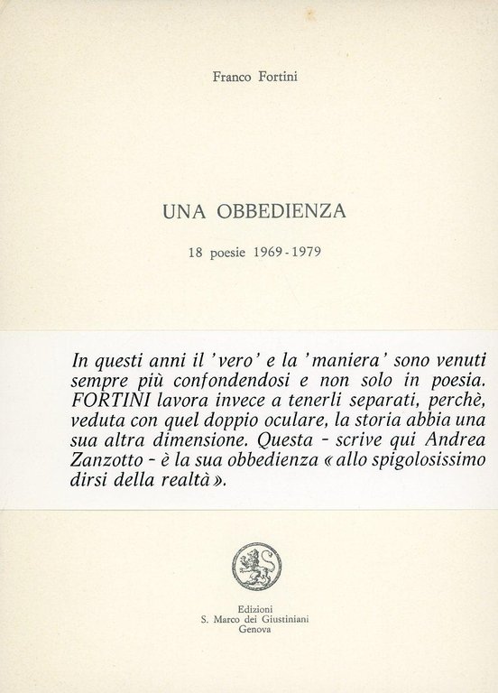 Una obbedienza. 18 poesie 1969-1979 | Libri antichi e moderni | FORTINI, Franco (Firenze, 1917 - Firenze, 1994)