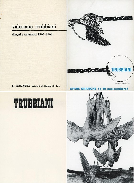 Catalogo di mostra, 27 aprile - 10 maggio 1968. Con 3 tavole in nero. Testo di Luciano Caramel. Biografia, attività espositiva, bibliografia . 8vo. pp. 16. . Molto buono (Very Good). . . . Si aggiungono altri 2 cataloghi dell'Artista: 1) Catalogo della mostra alla Galleria Blu, Milano marzo 1970. testo di Enrico Crispolti e 8 illustrazioni. 2) Catalogo della mostra alla Galleria La Margherita, Valeriano Trubbiani, Opere grafiche e 15 microsculture. Roma 3-25 marzo 1972. testo di Giorgio Di Genova e 14 illutrazioni