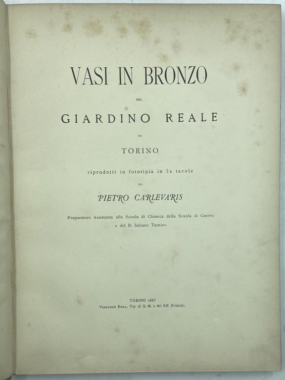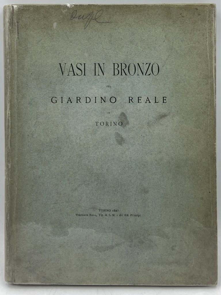 Cartonato editoriale a stampa, in ottavo cm 24 x 18, pp (8) + 32 tavole protette da velina. Piccolo timbro del fotografo, col motto Ars Lucis Domina Lux Artis, al colophon e su ogni fotografia. Esemplare n. 57 di una tiratura non precisata. Raccolta di fotografie, riprodotte in fototipia, dei vasi in bronzo conservati nel Palazzo Reale di Torino; la serie di recipienti, prodotti tra il XVI e il XVII secolo, era conservata nei giardini del palazzo e venne ritirata all’interno e sostituita da copie in ghisa poco prima della produzione di queste immagini. Il fotografo Pietro Carlevaris espose, ottenendo medaglie, fotografie ottenute attraverso procedimenti di sua invenzioni in diverse esposizioni torinesi e milanesi tra il 1880 e il 1890, e fu docente di chimica nel Regio Istituto Tecnico di Torino. Cat. 26, n. 12.