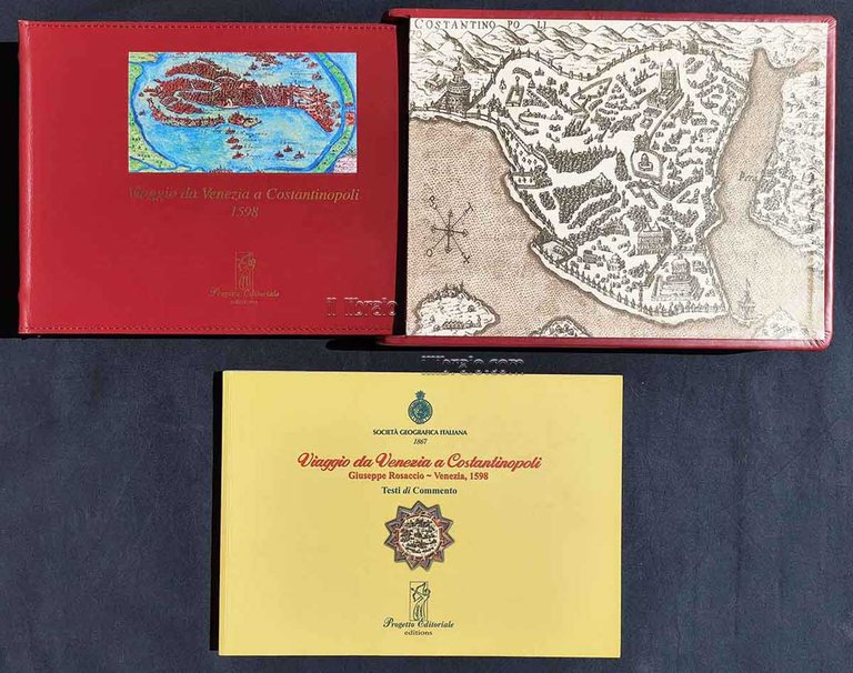 2 voll.; oblunghi (22 x 31 cm. ca.); pp. 164, 90 (ill. a col.); leg. artigianale in cuoio rosso con impressioni in oro, completo di astuccio sempre in cuoio. Tiratura di 300 esemplari numerati (ns. 148). Stampato su carta speciale Tintoretta Neve delle Cartiere Fedrigoni. Riproduzione anastatica dell'originale dell'Edizione del 1598, stampata a Venezia dall'Editore Giacomo Franco e dedicata all'Ambasciatore della Serenissima, Marco Veniero. Completa l'opera il volume di commentario al Facsimile con presentazione del Professor Franco Salvatori della Società Geografica Italiana e Compendio critico con testi di Gabriella Airaldi, Simonetta Conti, Francesco Surdich, Mustafa Soykut e Orietta Selva. Sul finire del '500, il friulano Giuseppe Rosaccio, cartografo e viaggiatore, creò una straordinaria opera sull'itinerario da Venezia a Costantinopoli. L'opera, ricca di 72 acquerelli, descriveva magnificamente il Mediterraneo orientale, crocevia di culture tra Europa e Islam.