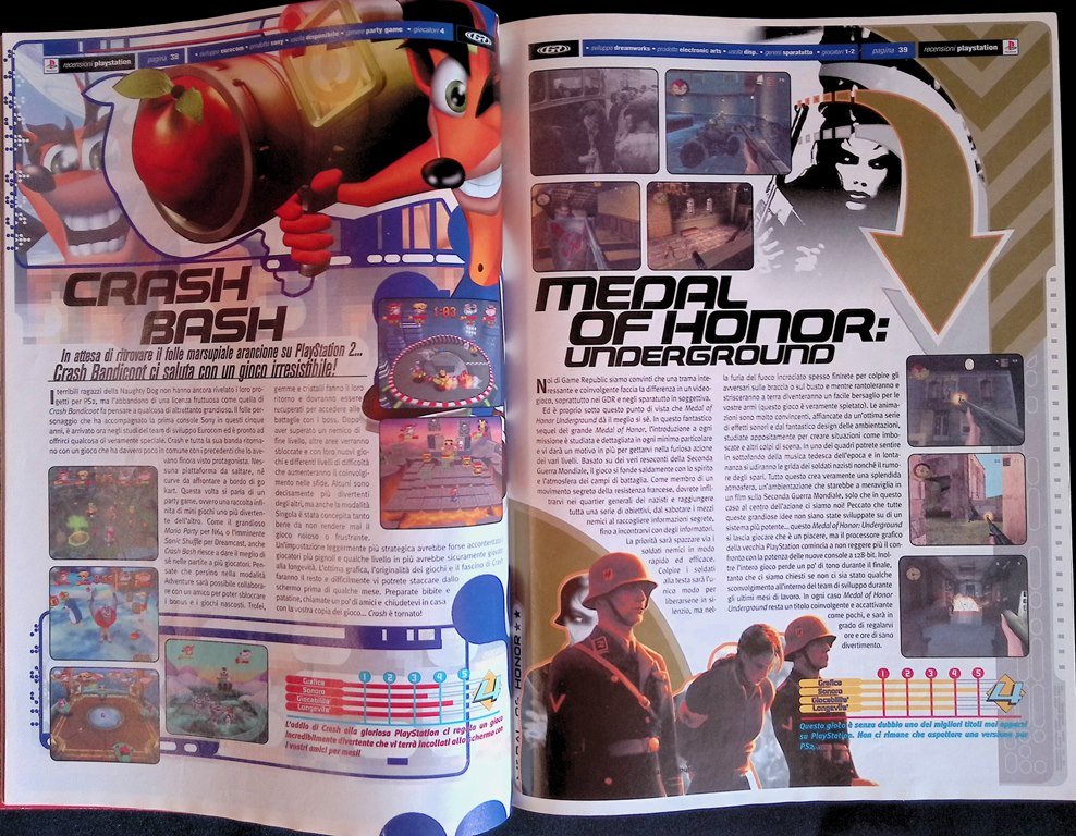 Recensioni: Crash Bash, Medal of Honor: Underground, Spyro: Year of the Dragon, Mega Man Legends 2 (Playstation), Zelda: Majora's Mask (Nintendo 64), Moto GP (Playstation 2), 4x4 evolution, Street Fighter 3, Spawn (Sega Dreamcast)