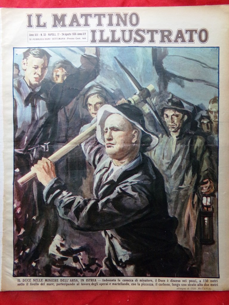Il duce nelle miniere dell'Arsa, in Istria - indossata la casacca di minatore, il Duce è disceso nei pozzi, a 150 metri sotto il livello del mare, partecipando al lavoro degli operai e martellando, con la piccozza, il carbone, lungo uno strato alto due metri (Ugo Matania)