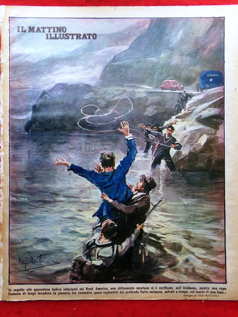 In seguito alle spaventose bufere infurianti sul Nord America, uno slittamento montano si è verificato nell'Alabama, mentre una cupa fiumana di fango invadeva la pianura: tre contadini, quasi inghiottiti dal profondo flutto melmoso, salvati a tempo, col lancio di una fune (Ugo Matania)
