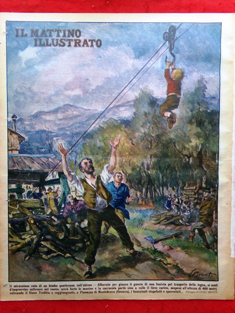 Il miracoloso volo di un bimbo quattrenne sull'abisso. Afferrato per giuoco il gancio di una funivia pel trasporto delle legna, si sentì d'improvviso sollevare nel vuoto: serrò forte le manine e la carrucola portò sino a valle il lieve carico, sospeso all'altezza di 400 metri, valicando il fiume Trebbia e raggiungendo, a Pianazzo di Montebruno (Genova) i boscaiuoli stupefatti e spaventati. (Luigi Bront)