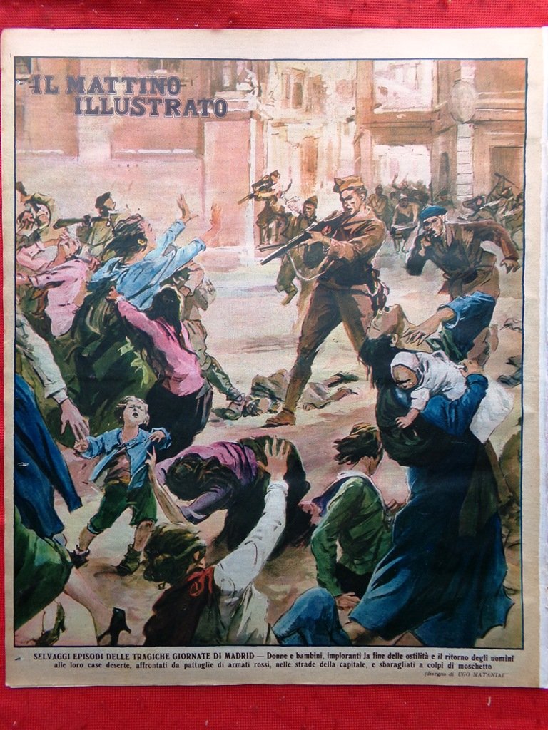Selvaggi episodi delle tragiche giornate di Madrid: donne e bambini, imploranti la fine delle ostilità e il ritorno degli uomini alle loro case deserte, affrontati da pattuglie di armati rossi, nelle strade della capitale, e sbaragliati a colpi di moschetto (Ugo Matania)