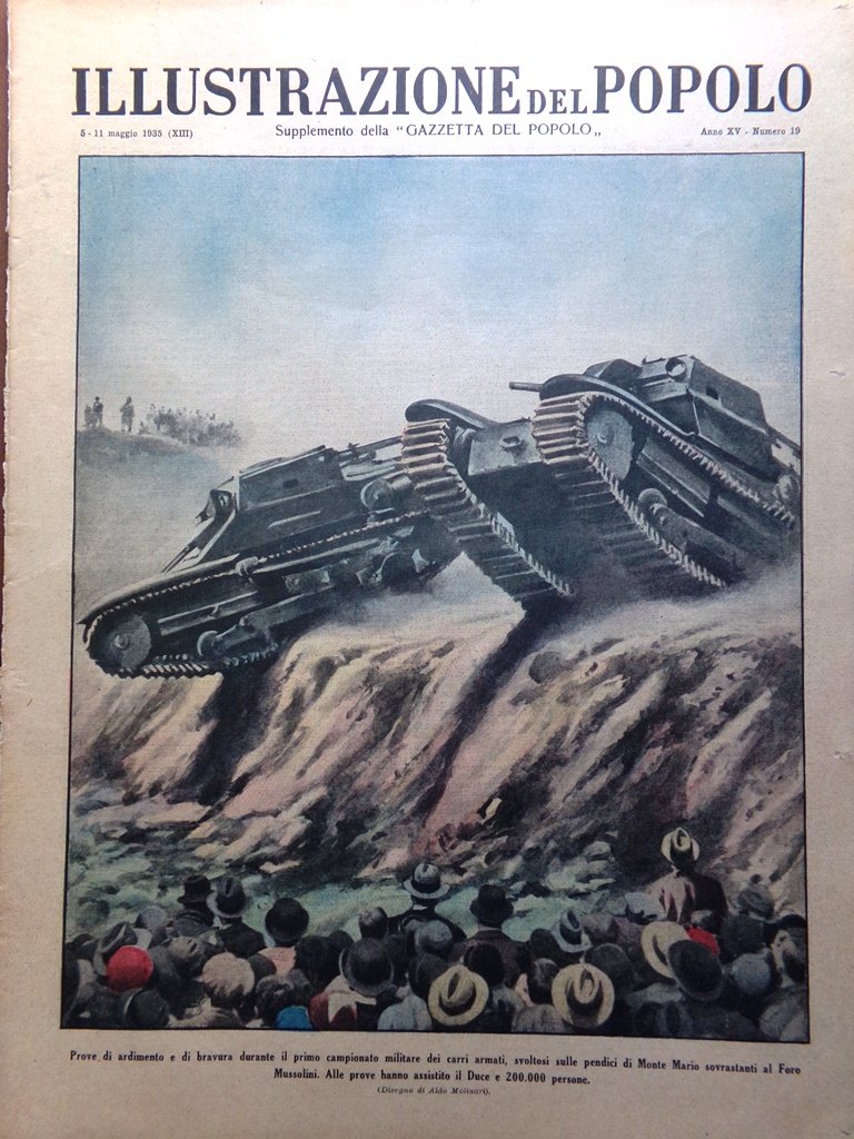 Prove di ardimento e di bravura durante il primo campionato militare dei carri armati, svoltosi sulle pendici di Monte Mario sovrastanti al Foro Mussolini. Alle prove hanno assistito il Duce e 200.000 persone (Aldo Molinari)