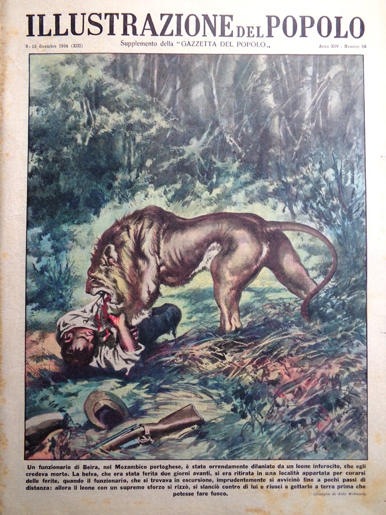 Un funzionario di Beira, nel Mozambico portoghese, è stato orrendamente dilaniato da un leone inferocito, che egli credeva morto. La belva, che era stata ferita due giorni avanti si era ritirata in una località appartata per curarsi delle ferite, quando il funzionario, che si trovava in escursione, imprudentemente si avvicinò fino a pochi passi di distanza: allora il leone con un supremo sforzo si rizzò, si slanciò contro di lui e riuscì a gettarlo at erra prima che potesse fare fuoco (Aldo Molinari)