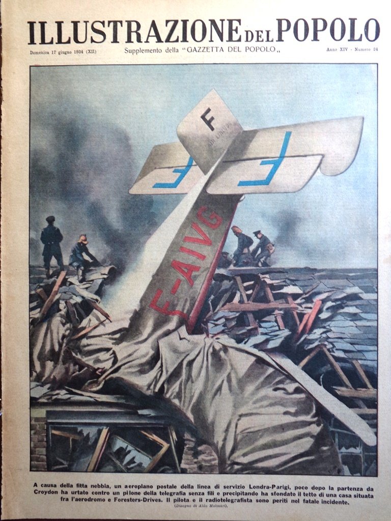 A causa della fitta nebbia, un aeroplano postale della linea di servizio Londra-Parigi, poco dopo la partenza da Croydon ha urtato contro un pilone della telegrafia senza fili e precipitando ha sfondato il tetto di una casa situata fra l'aerodromo e Foresters-Drivers. Il pilota e il radiotelegrafista sono periti nel fatale incidente (Aldo Molinari)