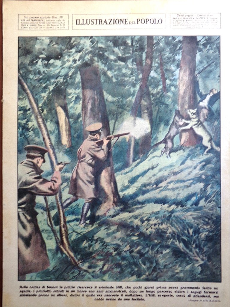 Nell contea di Sussex la polizia ricercava il criminale Hill, che pochi giorni prima aveva gravemente ferito un agente. I poliziotti, entrati in un bosco con cani ammaestrati, dopo un lungo percorso videro i segugi fermarsi abbaiando presso un albero, dietro il quale era nascosto il malfattore. L'Hill, scoperto, cercò di difendersi, ma cadde ucciso da una fucilata (Aldo Molinari)