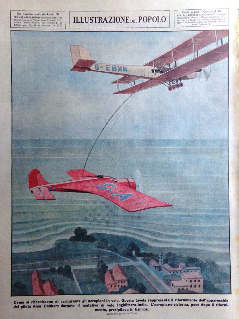 Come si riforniscono di carburante gli aeroplani in volo. Questa tavola rappresenta il rifornimento dell'apparecchio del pilota Alan Cobham durante il tentativo di volo Inghilterra-India. L'aeroplano-cisterna, poco dopo il rifornimento, precipitava in fiamme (Carlo Nicco)